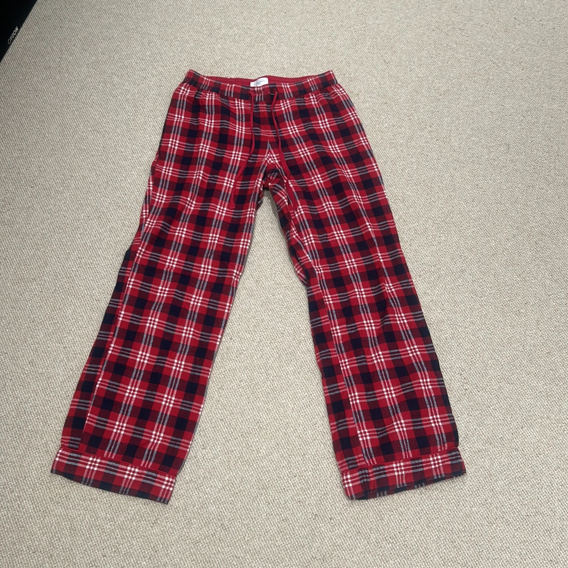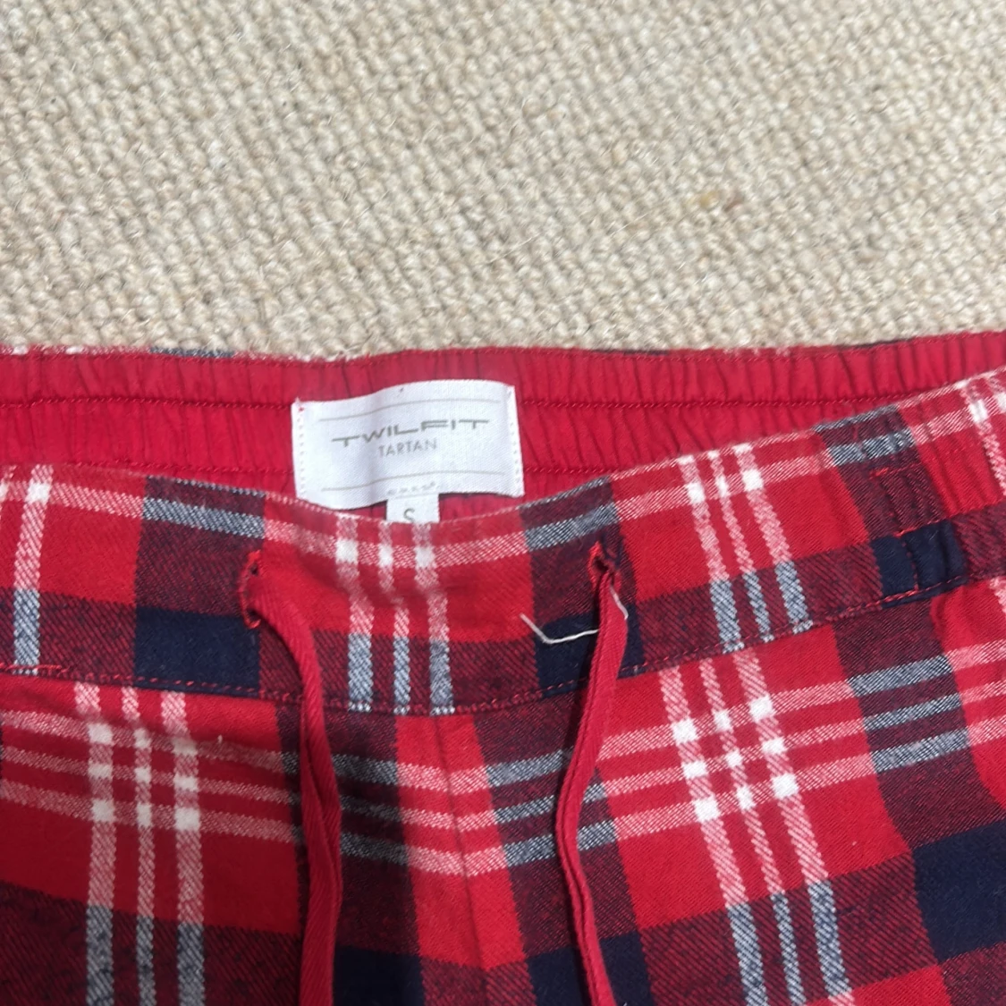 Säljer ett par mysiga röda rutiga byxor från Twilfit. Perfekta för en avslappnad dag hemma eller som pyjamasbyxor. De har en bekväm passform med snörning i midjan för justerbarhet. Materialet känns mjukt och skönt mot huden.