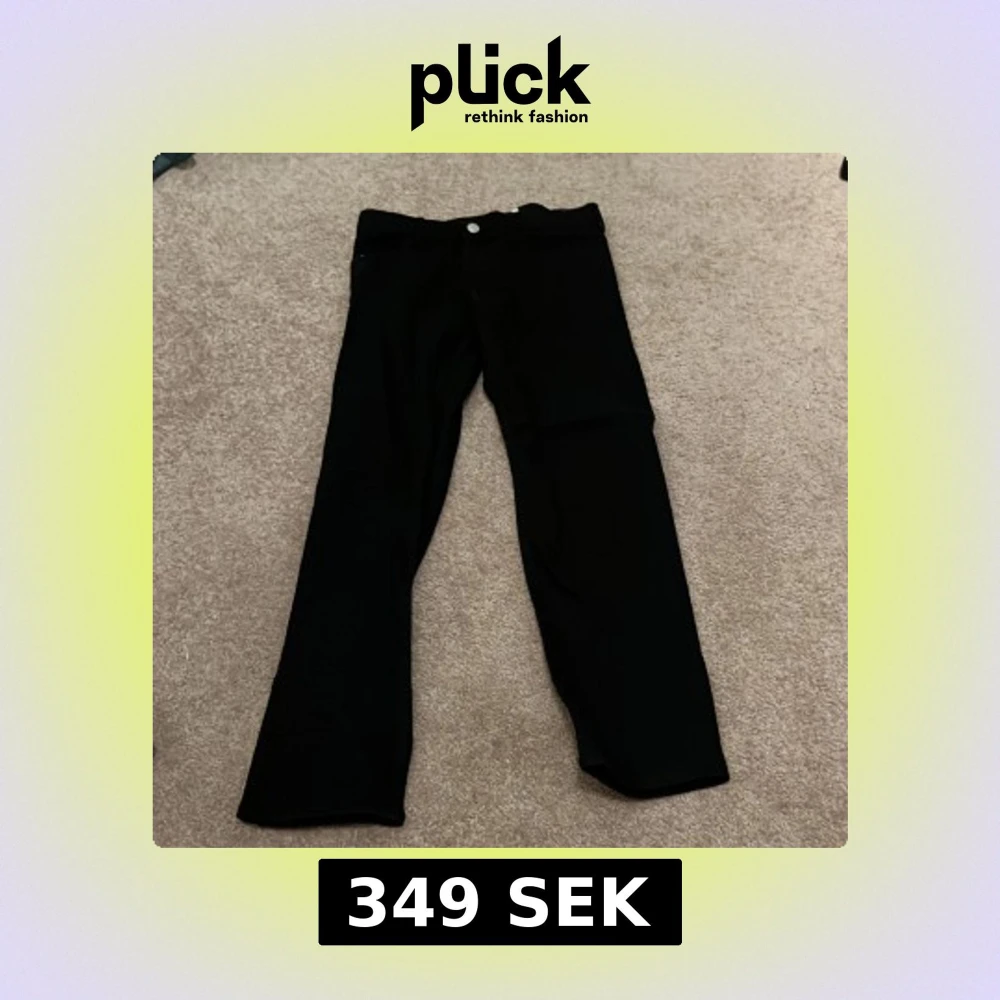 Snygga svarta byxor från H&M i slim fit med justerbar midja. Perfekta för en stilren look. Byxorna har en klassisk design med knappar och dragkedja.