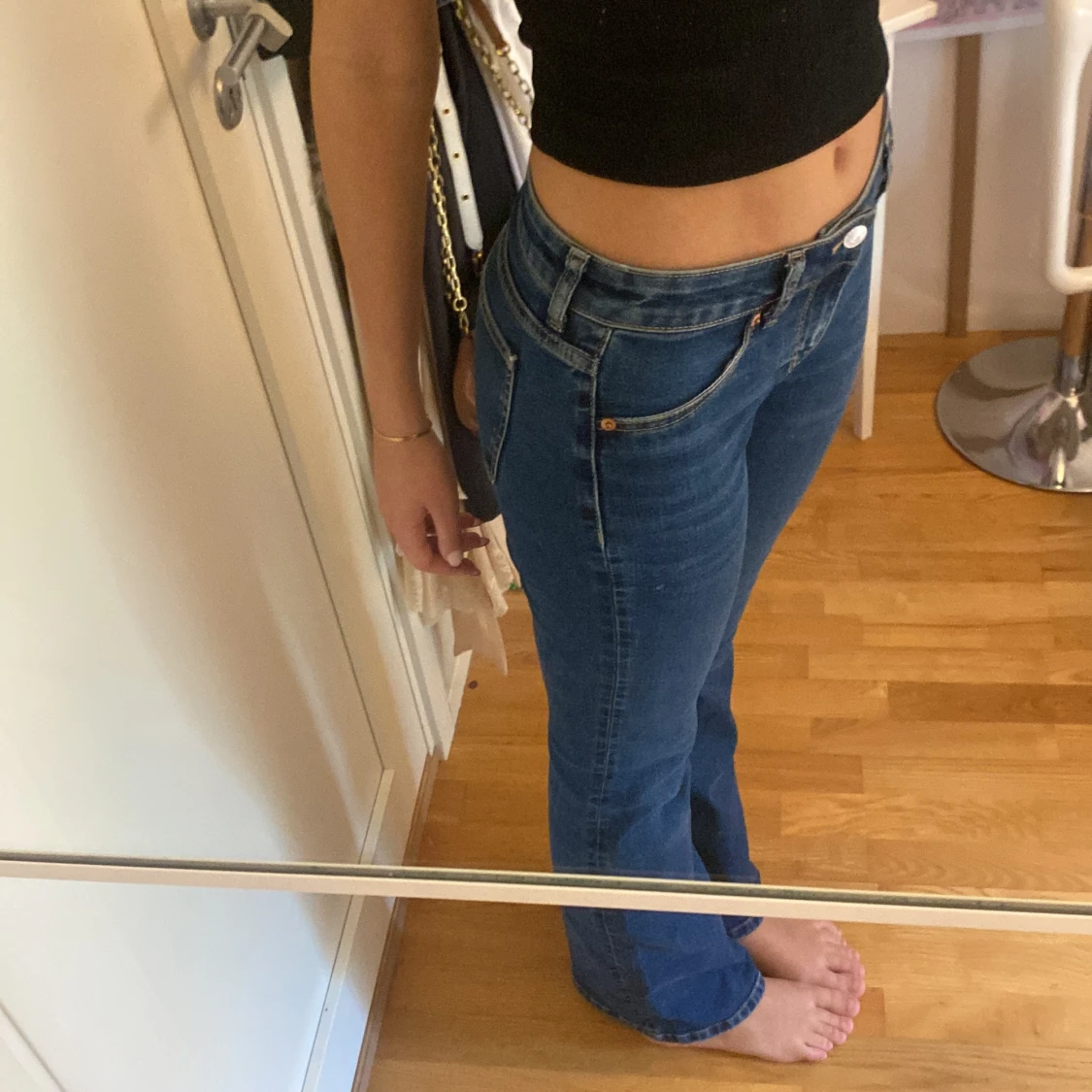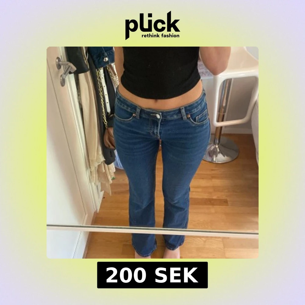 Säljer ett par klassiska blå jeans med bootcut och låg midja. . De har en snygg passform som sitter tajt upptill och släpper vid vaden. De är mycket använda men fortfarande bra skick. De är lite för korta enligt mig som är 172 🤍