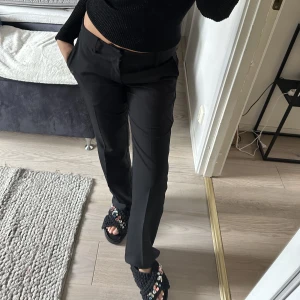 Lågmidjade kostymbyxor  - Säljer ett par svarta kostymbyxor byxor med rak passform och låg midja. Byxorna har en klassisk look och är enkla att matcha med olika toppar. Perfekta om du gillar stilrena och bekväma plagg.