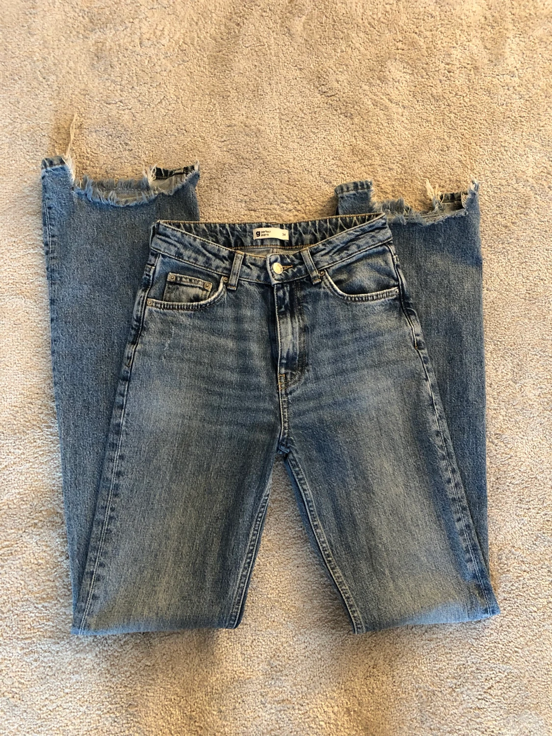 Säljer jeans från Gina Tricot, har ett hål i knät och ”fransar” vid benen. Fin passform och passar bra till runt 169 cm. Fint skick! Säljer för att de blivit försmå.