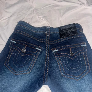 True Religion blå bootcut jeans - Säljer ett par blå bootcut jeans från True Religion med slitna detaljer och grova revor framtill. Jeansen har låg midja, klassiska fickor med broderad logga och kontrastsömmar. Materialet är jeans med en skön bomullskänsla. Perfekt för dig som gillar en edgy och avslappnad stil.