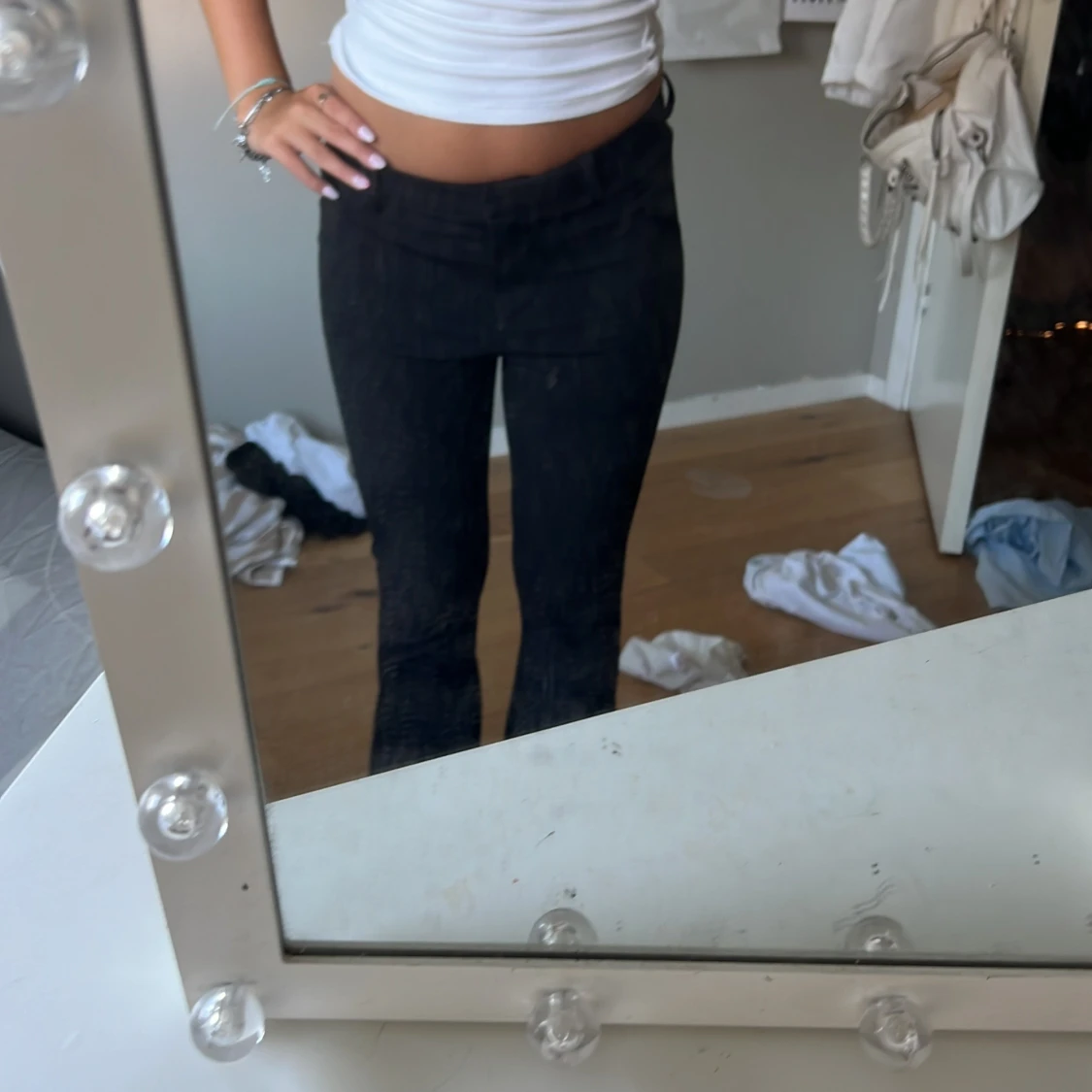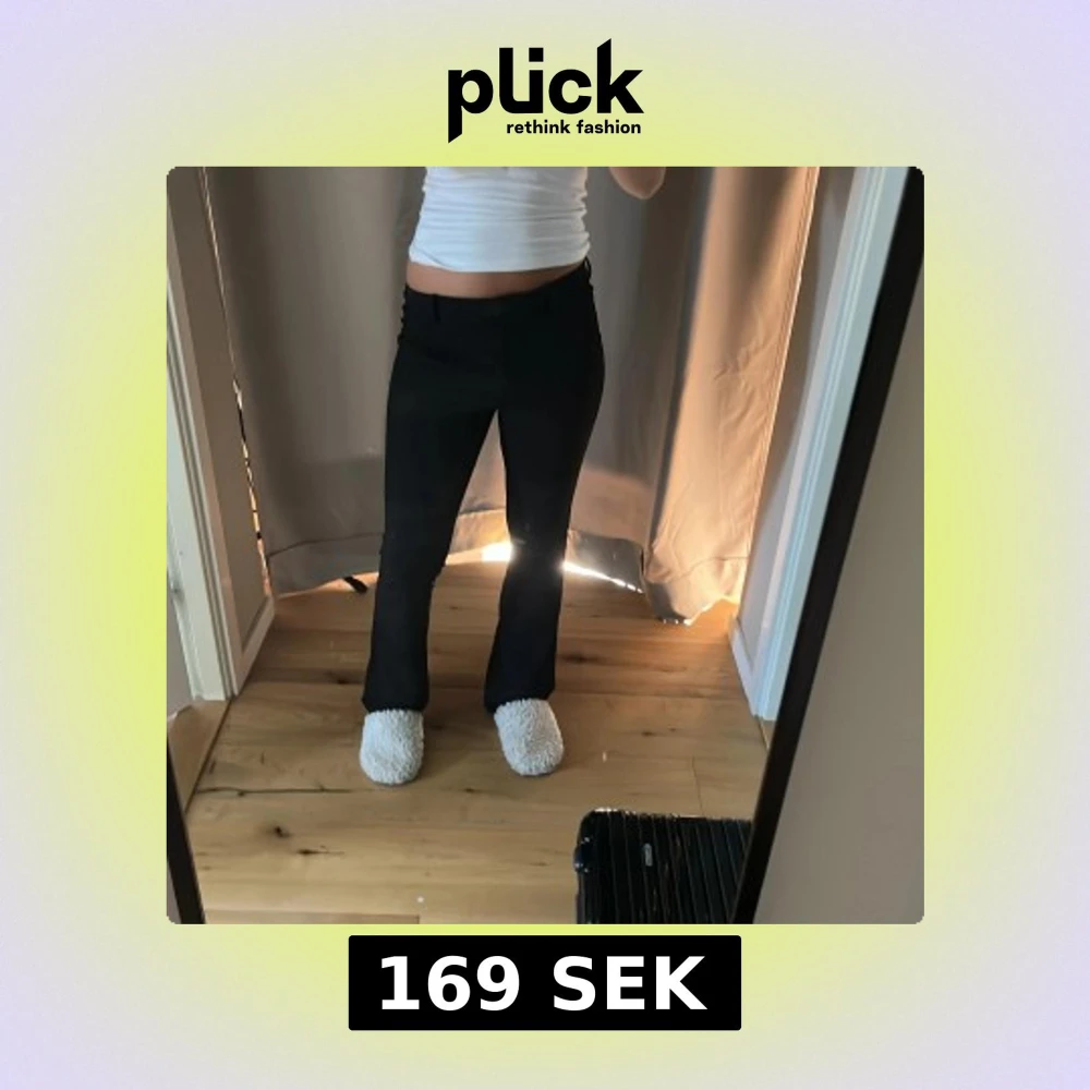 Säljer ett par svarta byxor med bootcut-snitt och låg midja. De har en klassisk look med smal passform upptill och utsvängda ben. Perfekta för dig som gillar en stilren och trendig vibe. Passar till allt och är superenkla att styla.