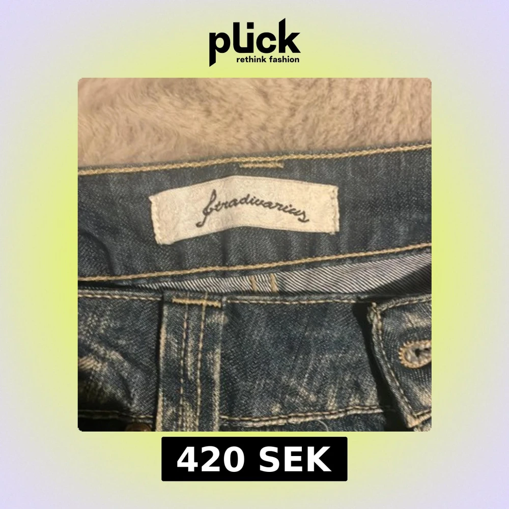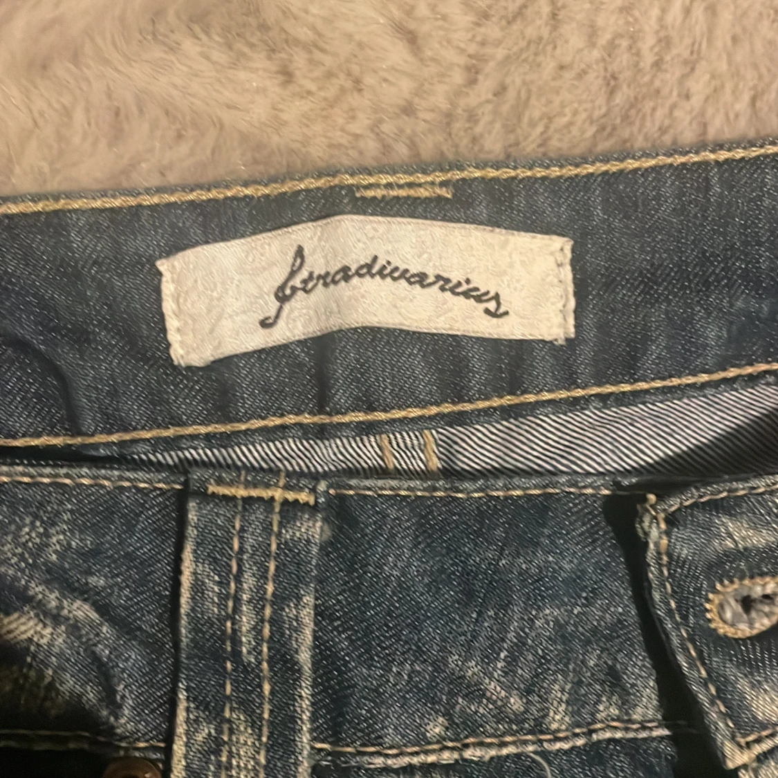 Säljer ett par blå jeans från Stradivarius med snyggt slitna detaljer och kontrastsömmar. Jeansen har klassisk femficksdesign, raka ben och coola broderier på bakfickorna. Perfekta för en avslappnad och trendig look.