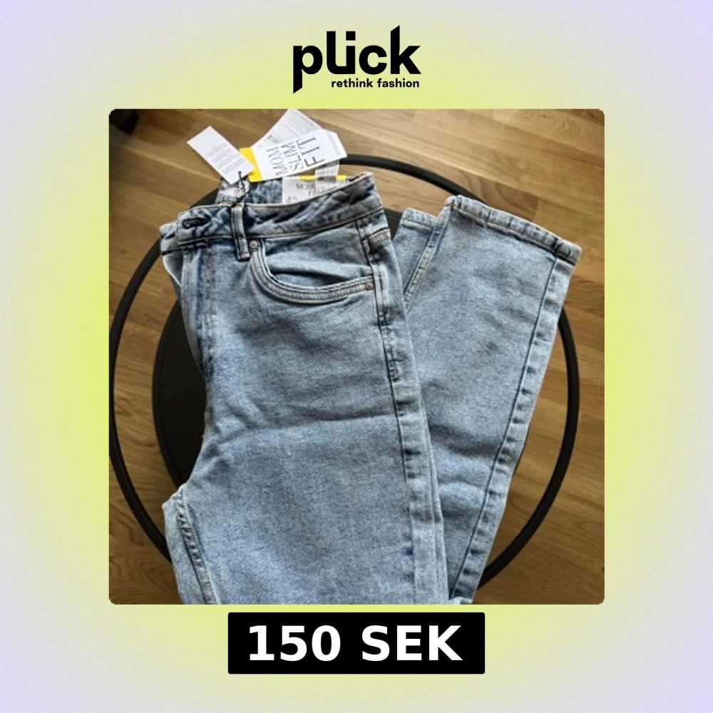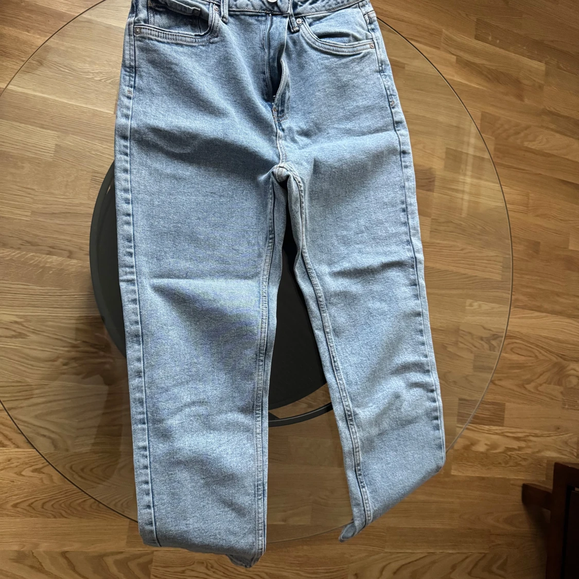 Säljer ett par ljusblå jeans med normal passform. Klassisk design med fem fickor och knappgylf. Perfekta för en avslappnad stil.
