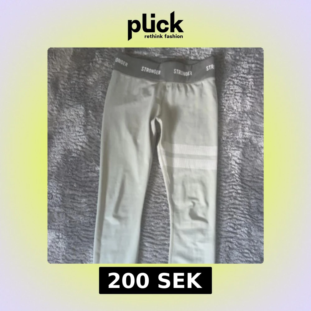 Snygga leggings från Stronger med bred resår i midjan där loggan STRONGER syns runtom. Byxorna har två vita ränder på ena benet och är tillverkade i ett stretchigt material som passar perfekt till träning. Dom är inte alls använda och är som nya!