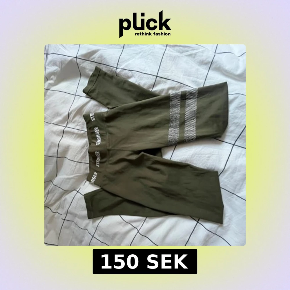 Snygga gröna träningsbyxor från Stronger med vita logotyper i midjan och två vita randiga detaljer på ena benet. Dem sitter taight och har hög midja, säljer för att dem är försmå, har används ganska många gånger och har slitits på de två vita detaljerna på benet, lite uttöjda på baksidan annars är dem i bra skick