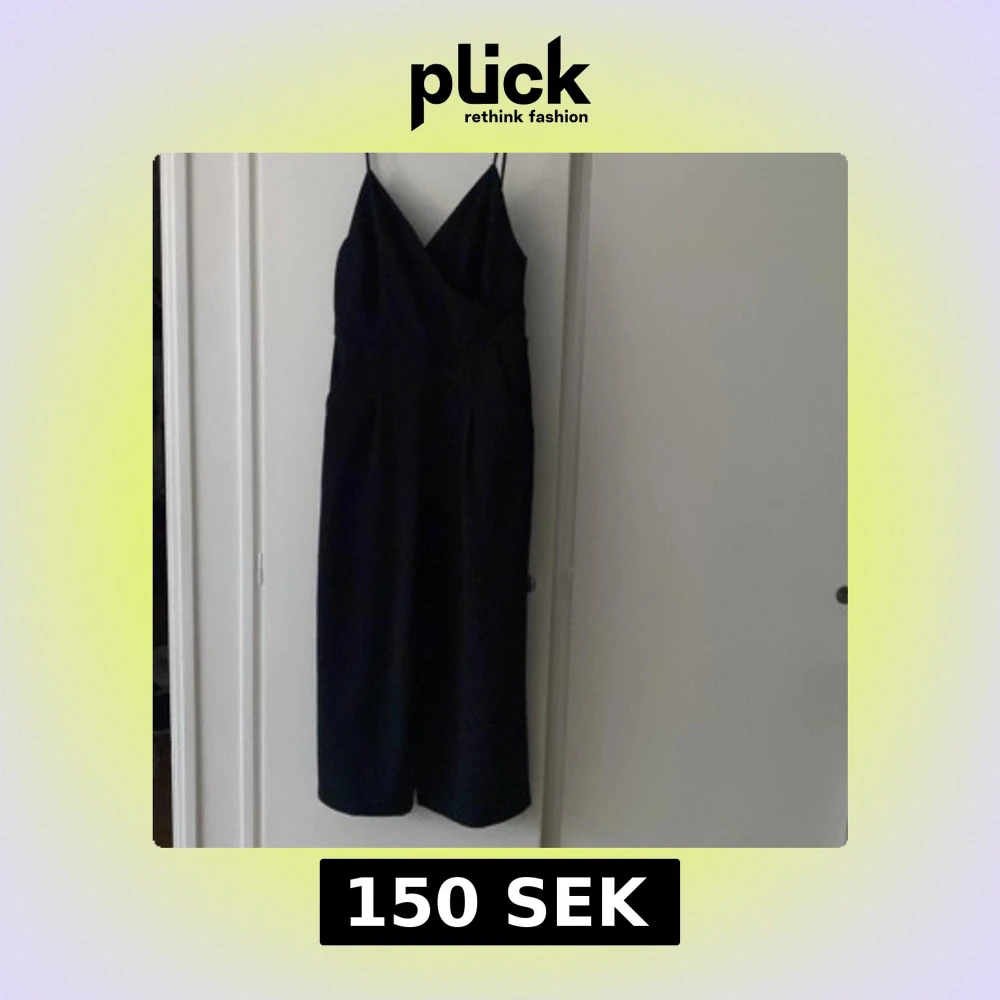 Elegant svart byxdress med smala axelband och omlott-design. Den har en v-ringad framdel och dragkedja i ryggen som är lite öppen. Perfekt för en stilren look.