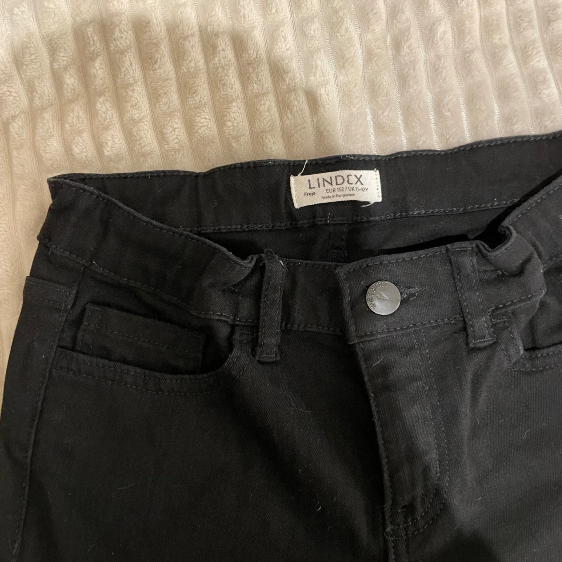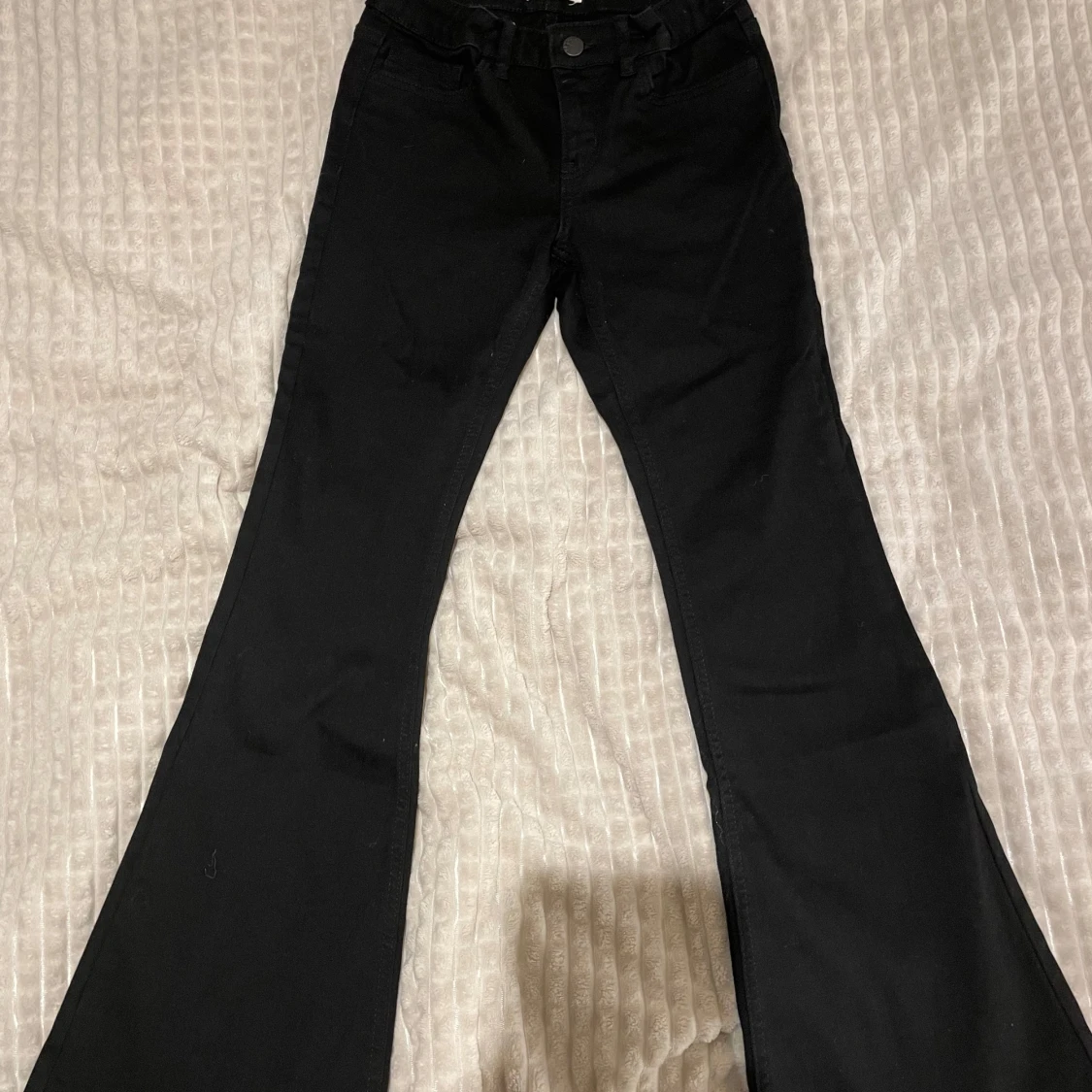 Snygga svarta bootcut jeans från Lindex. De har en klassisk femficksdesign och stängs med knapp och dragkedja. Perfekta för en stilren look.
