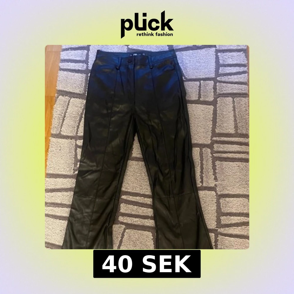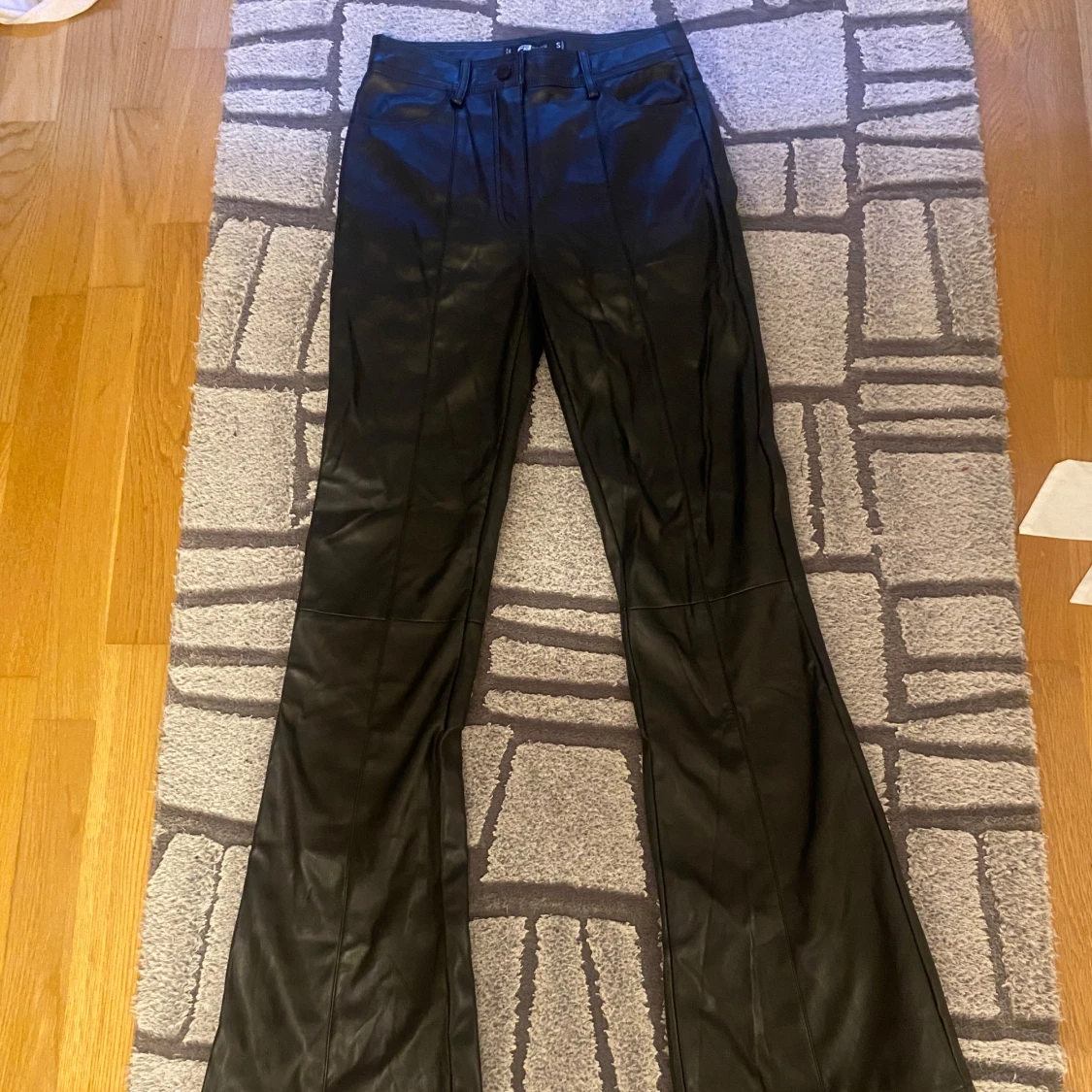 Snygga svarta byxor i skinnimitation med bootcut-modell och hög midja. Byxorna har pressveck framtill och bälteshällor, vilket ger en clean och trendig look. Perfekta för dig som vill sticka ut med en edgy vibe.