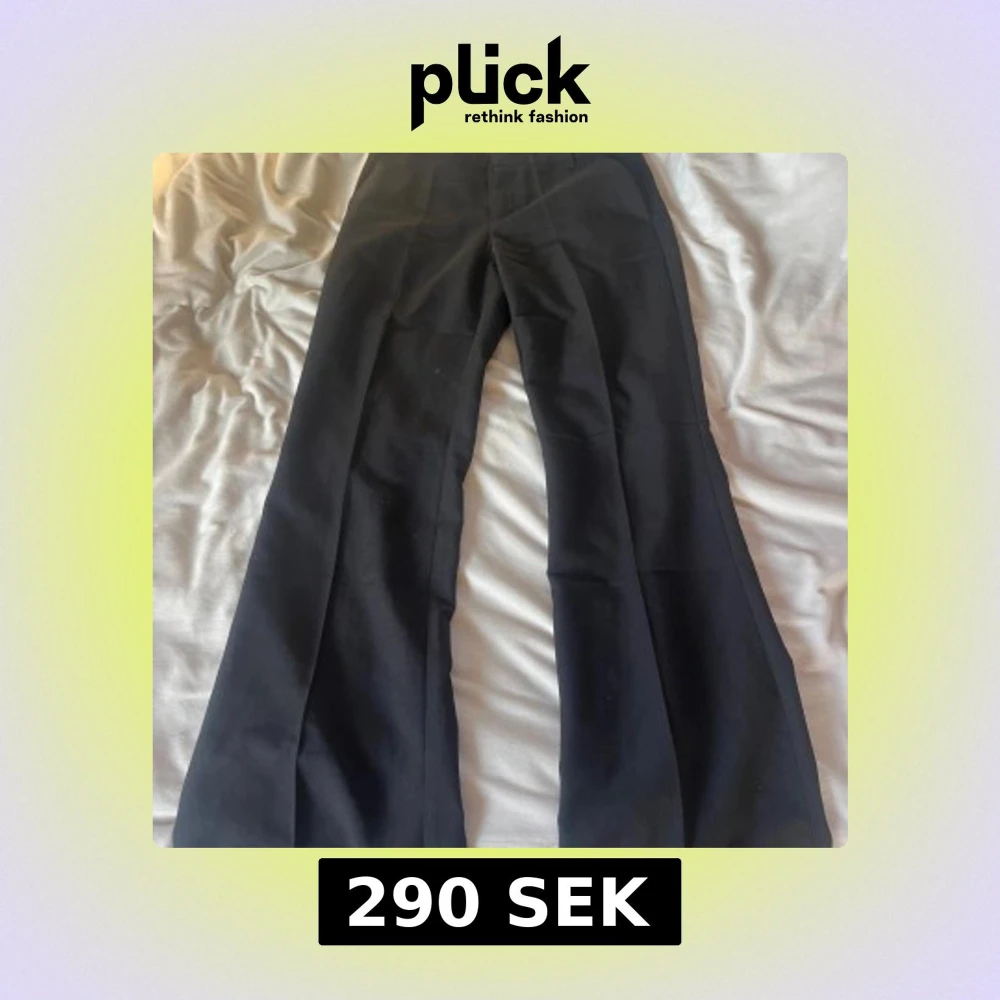 Snygga svarta kostymbyxor med bootcut-snitt och hög midja. Byxorna har en klassisk rak passform upptill och blir vidare nedtill, vilket ger en trendig siluett. Perfekta att matcha med en cool topp eller hoodie för en stilren look.