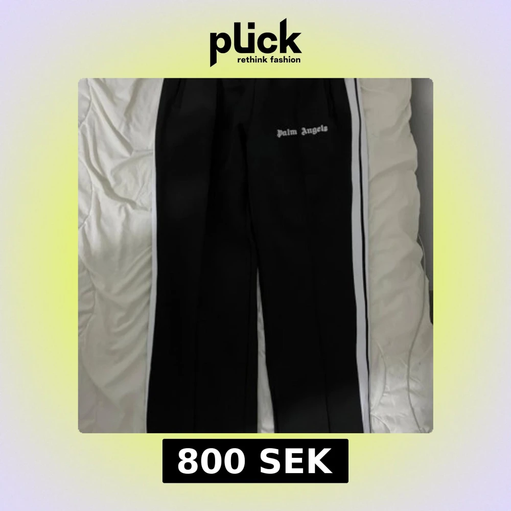 Säljer ett par svarta byxor från Palm Angels med vita ränder längs sidorna och logga tryckt på vänster sida. Byxorna har raka ben och sidofickor, perfekt för en sportig och trendig look.