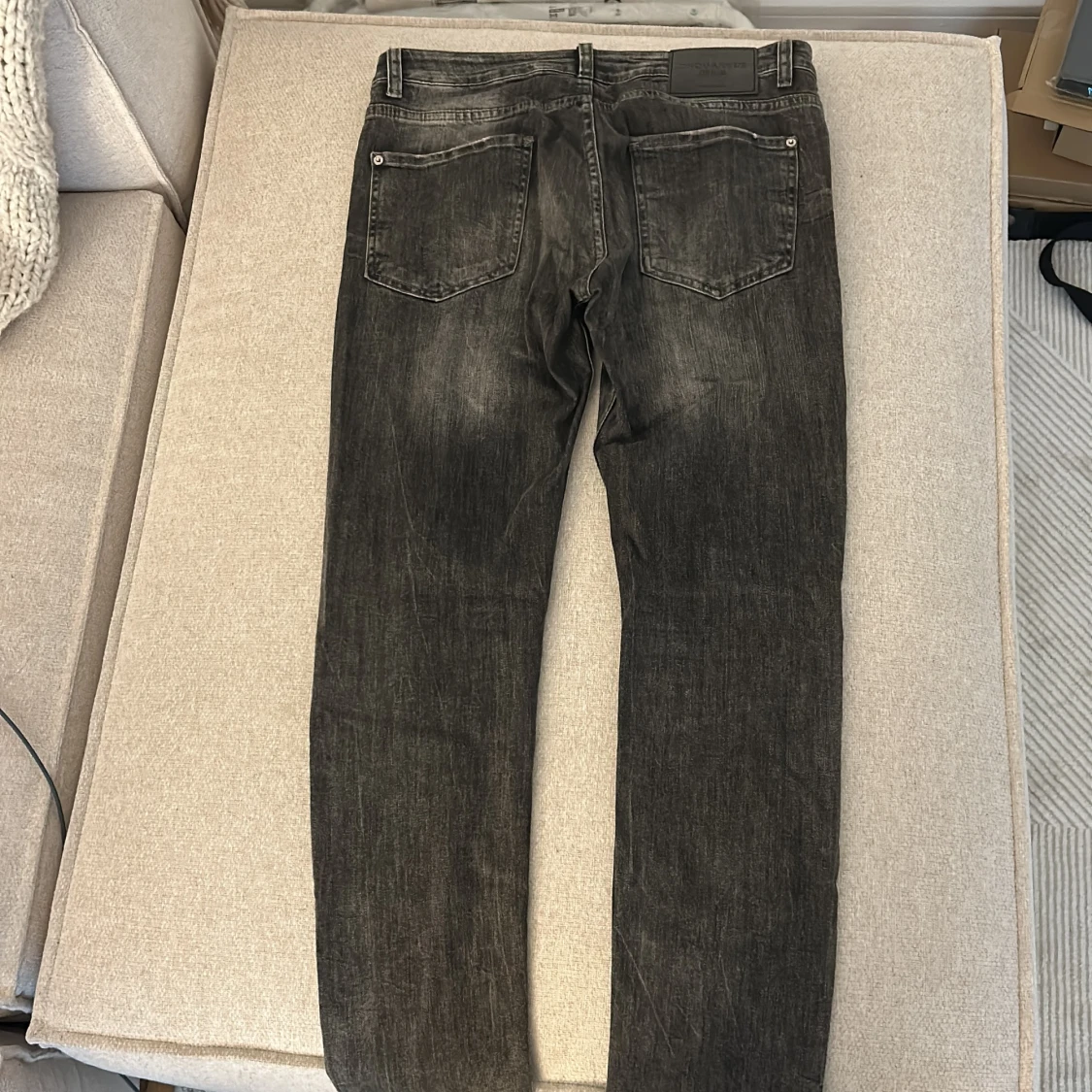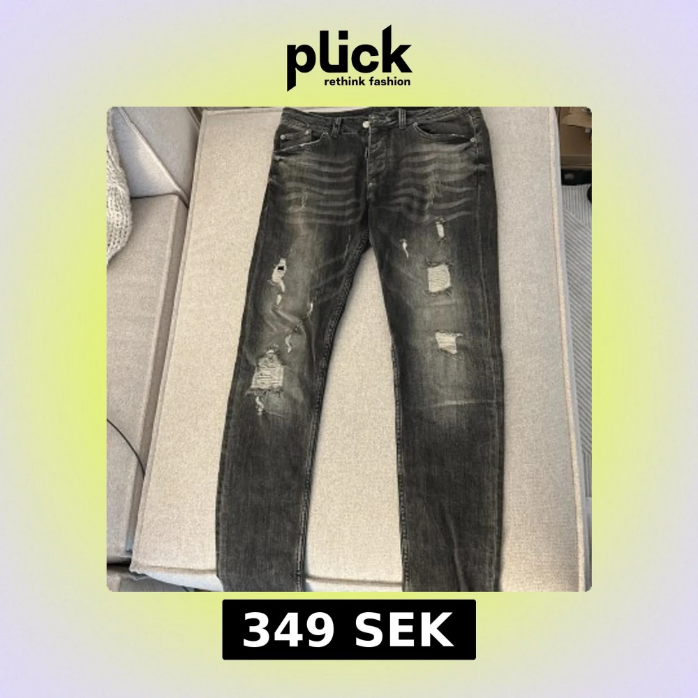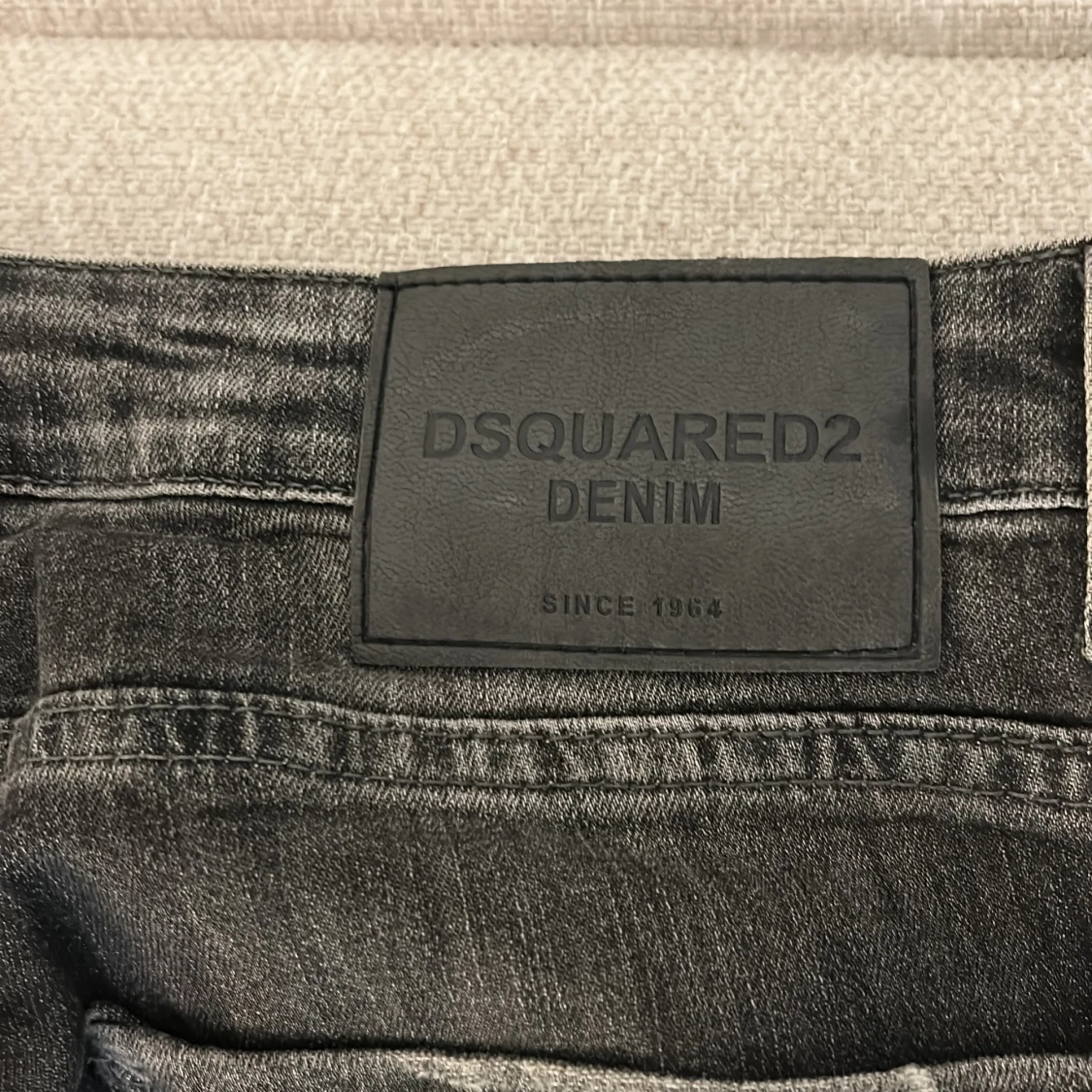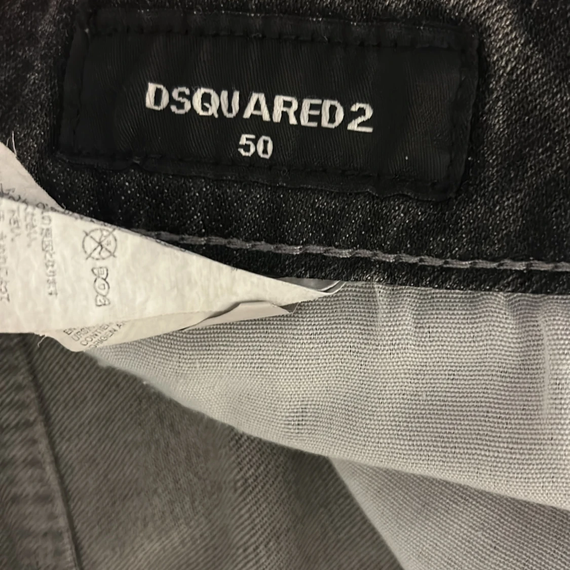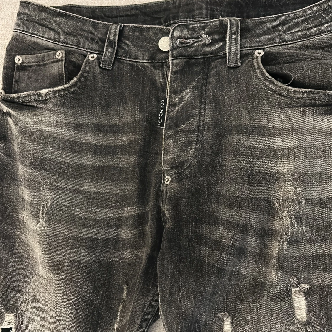 Säljer ett par svarta jeans från Dsquared2 i storlek 50. Jeansen har slitna detaljer och trasiga partier framtill för en riktigt edgy look. De är raka i modellen och har klassisk femficksdesign. Perfekta för dig som gillar streetstyle och vill sticka ut.