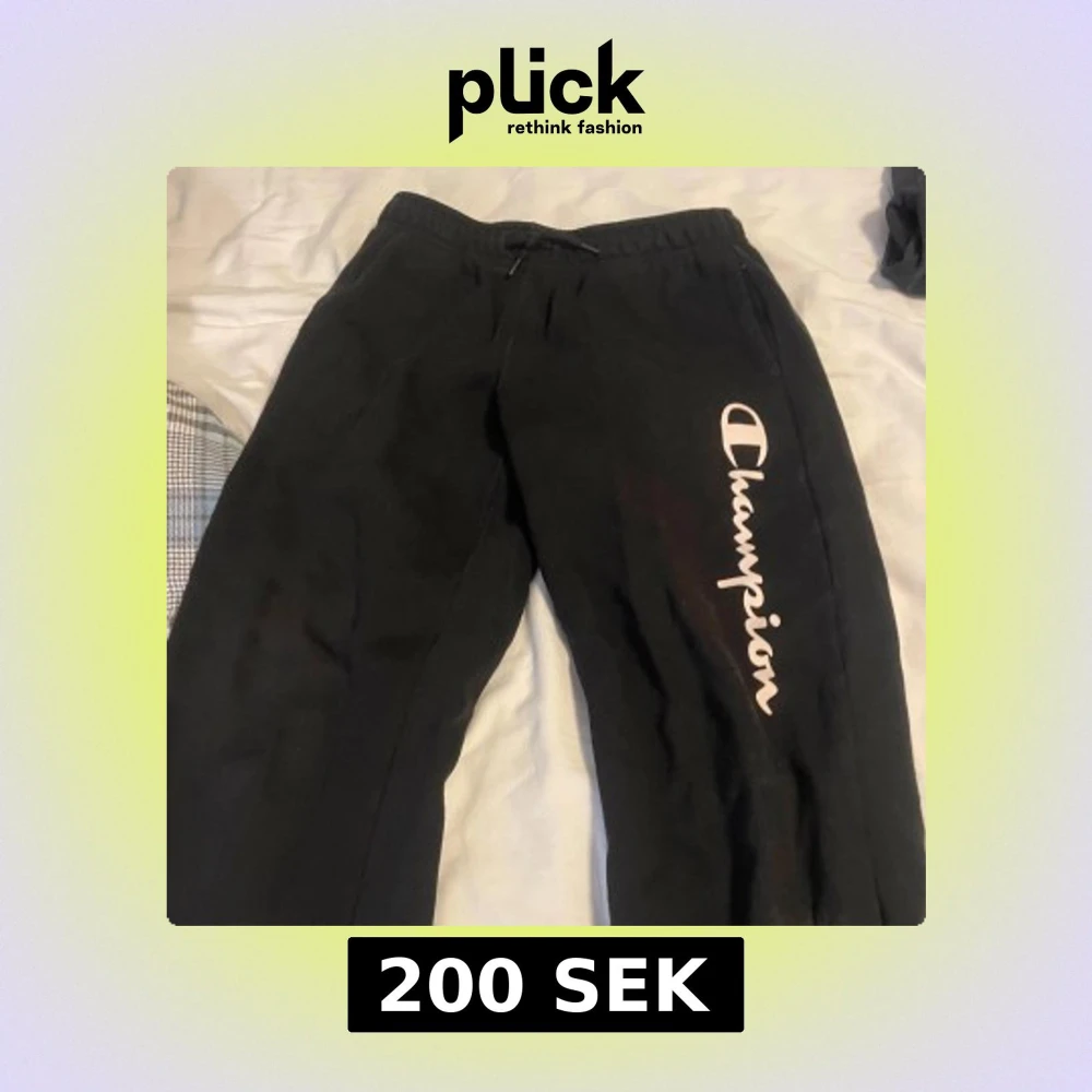Säljer ett par svarta mjukisbyxor från Champion med logga längs benet. Byxorna är tillverkade i en mjuk bomulls- och polyesterblandning, perfekta för en avslappnad stil. De har en elastisk midja för extra komfort.