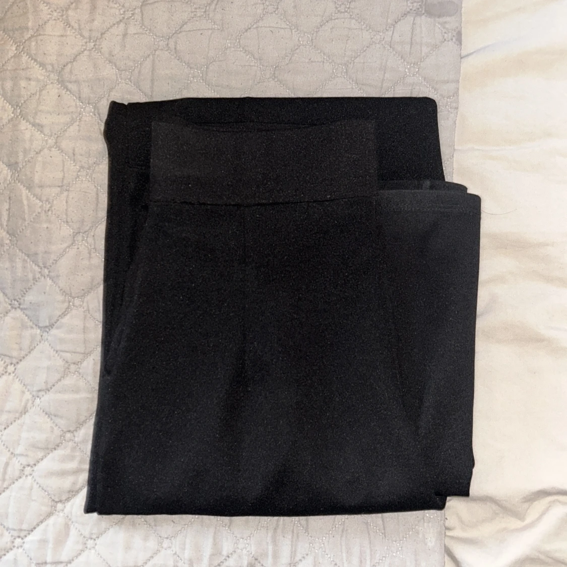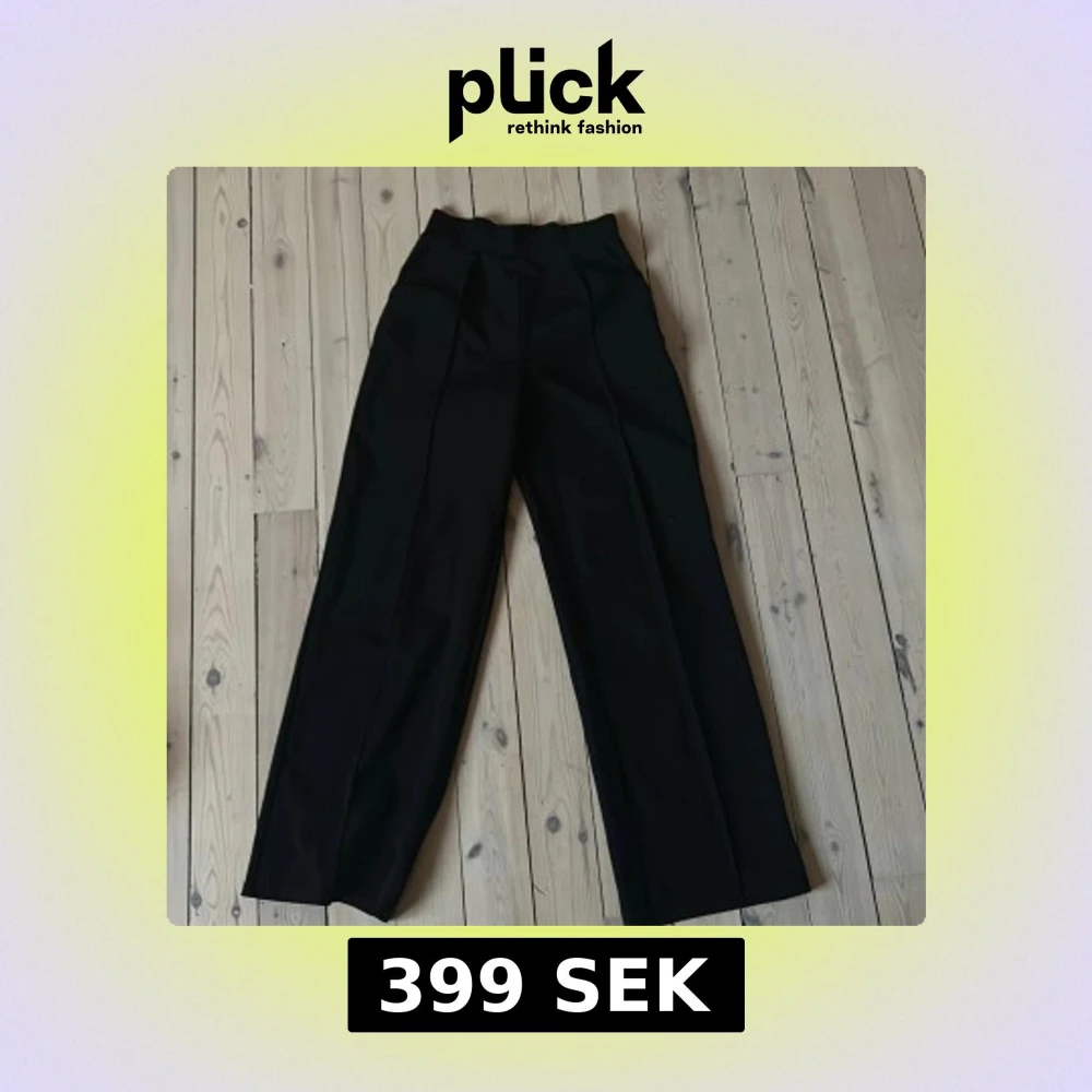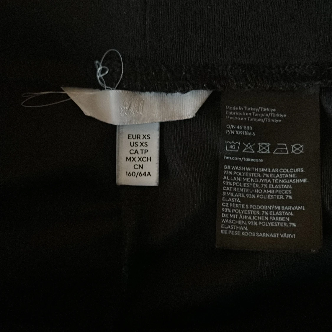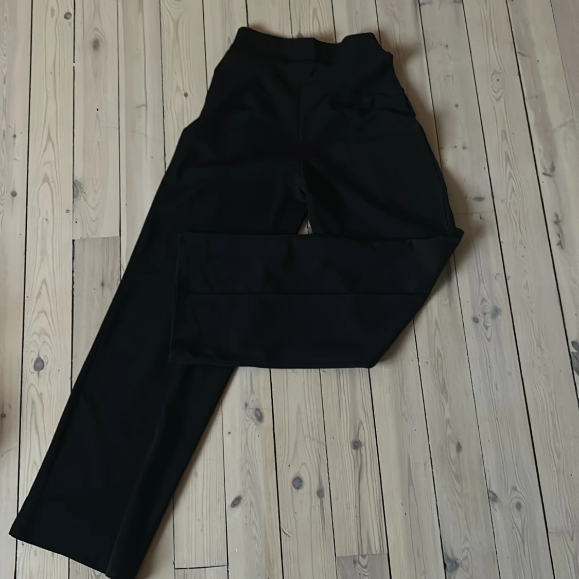 Svarta byxor från H&M i storlek XS med hög midja och vida ben. Byxorna är tillverkade i stretchigt material med 93% polyester och 7% elastan, vilket gör dem bekväma och följsamma. Snyggt skräddad look med pressveck framtill. Sitter jätte fina runt midjan men var tyvärr för långa för mig!💕
