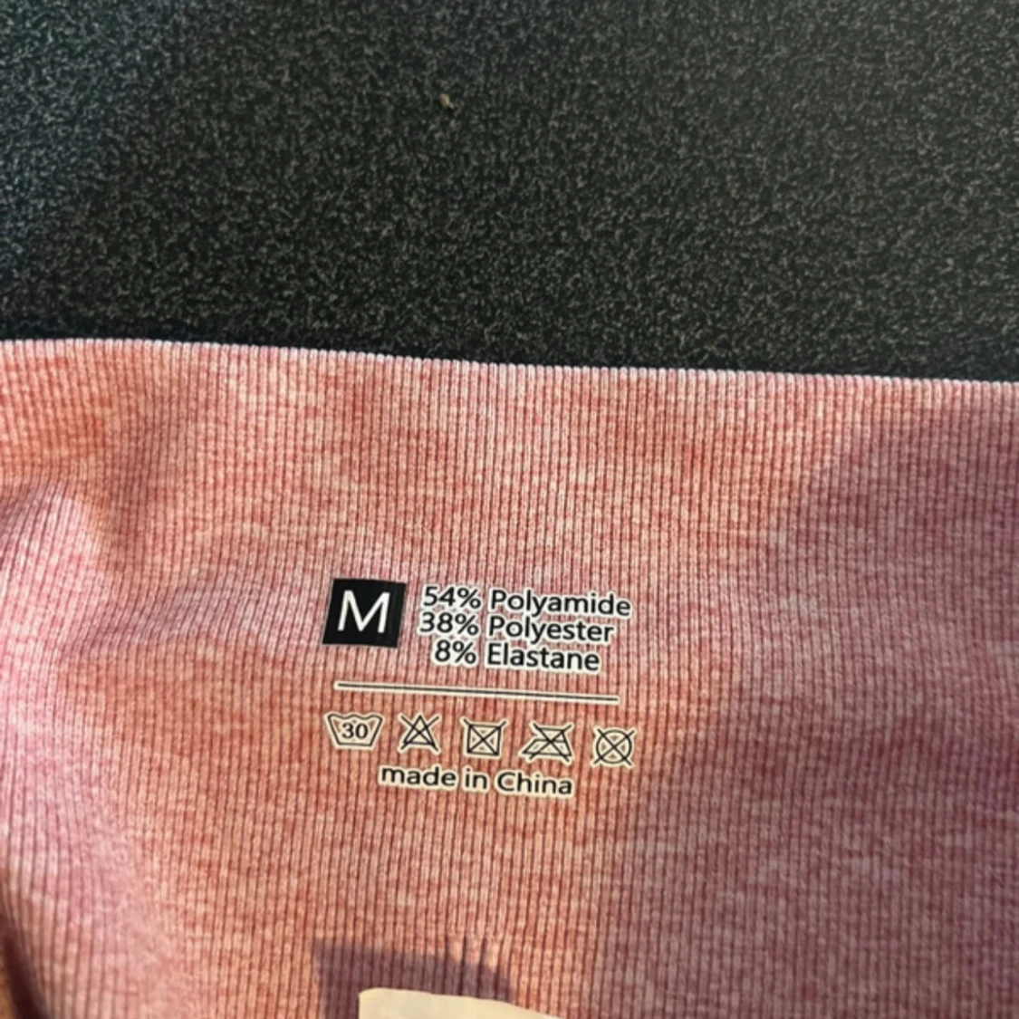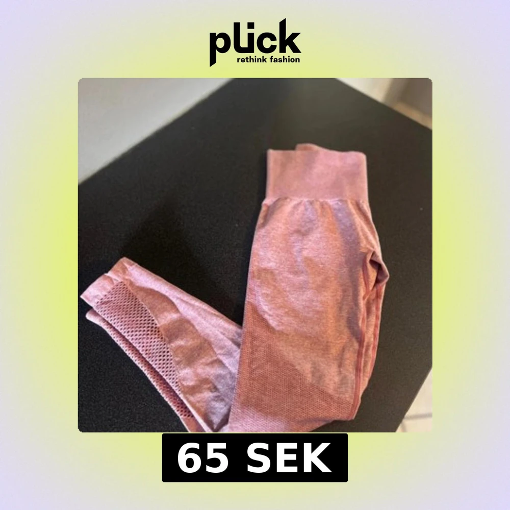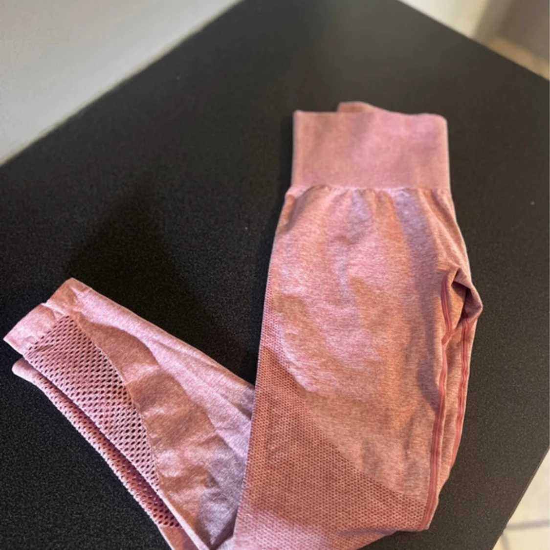 Säljer ett par rosa seamless leggings i storlek M med bred midja och snygga meshdetaljer längs benen. Tillverkade i en mix av polyamid, polyester och elastan för en stretchig och bekväm passform. Perfekta för träning eller chill.