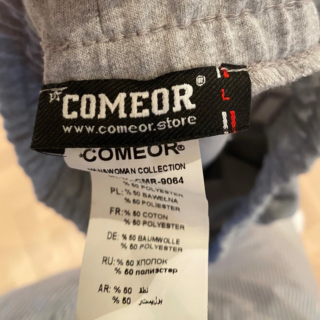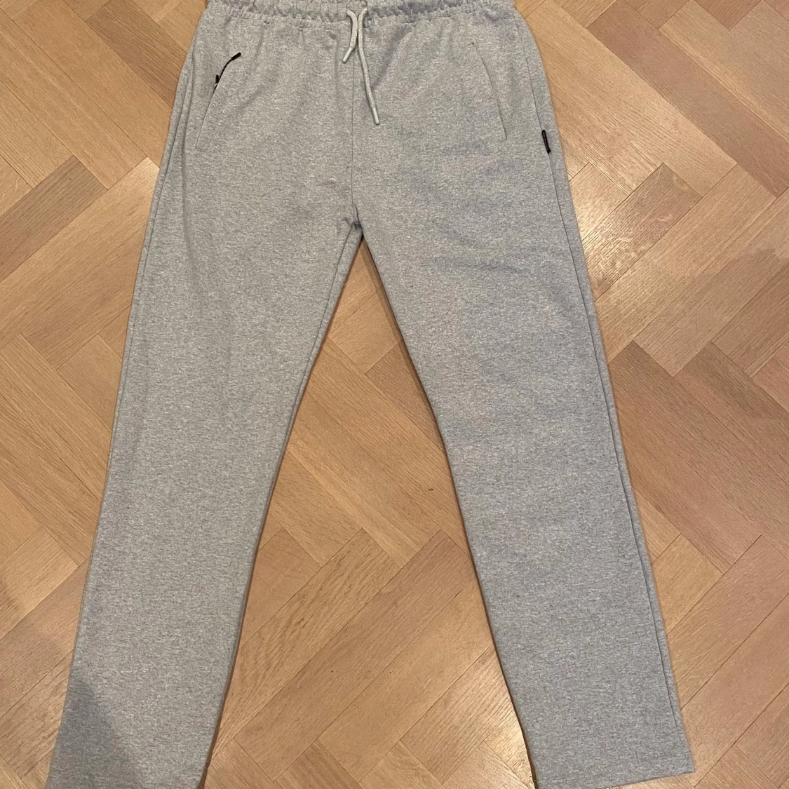 Säljer ett par klassiska grå mjukisbyxor från Comeor med dragsko i midjan och fickor med dragkedja. Perfekta för en avslappnad stil eller till träning. Tillverkade i en mjuk bomulls- och polyestermix.