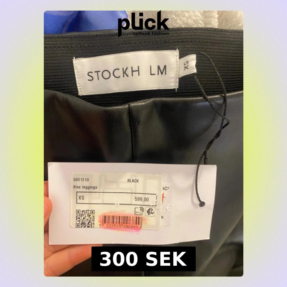 Snygga svarta leggings från Stockholm LM i skinnimitation. Modellen heter Alex och har en hög midja med elastisk linning. Byxorna är tighta och har en stilren look som passar till många olika outfits. Perfekt för dig som gillar trendiga och bekväma byxor. Original pris 600 kr. ALDRIG andvända