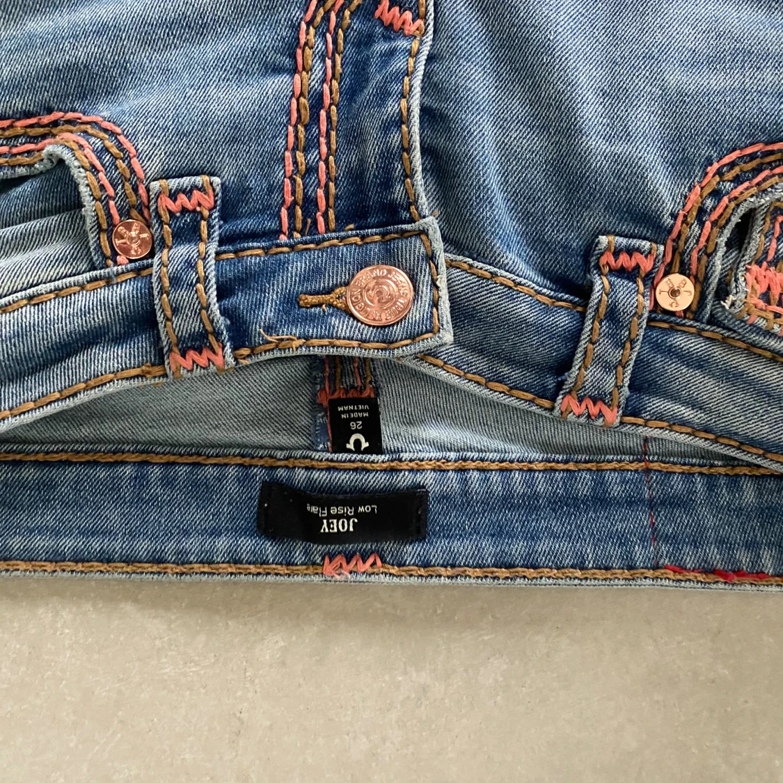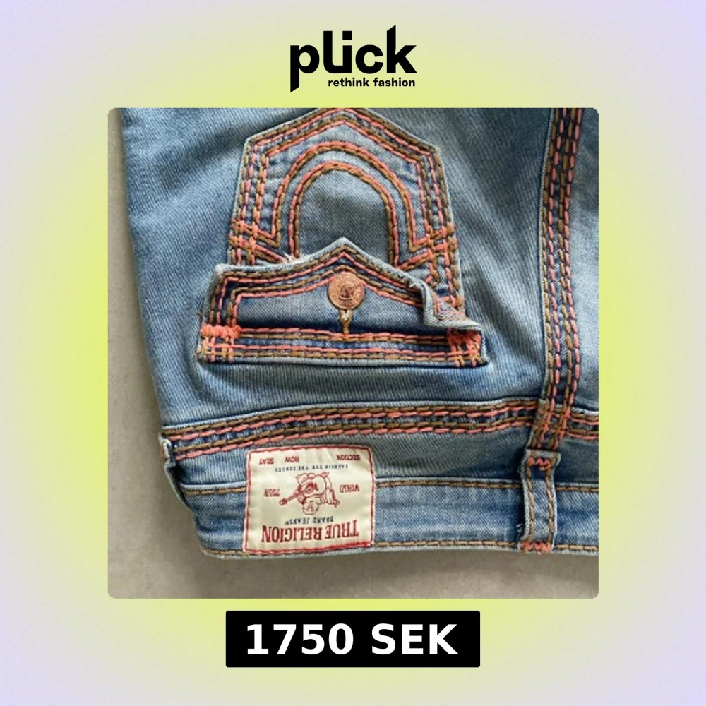 Säljer ett par ljusblå True Religion Joey jeans med orange och rosa kontrastsömmar, låg midja och klassiska fickdetaljer med kopparfärgade knappar. Jeansen har en unik design och är tillverkade i bomull. De ligger runt 2000kr nypris. Dock har jag trampat sönder de en gnutta längst ned, därav priset. Inget som syns när de bärs!