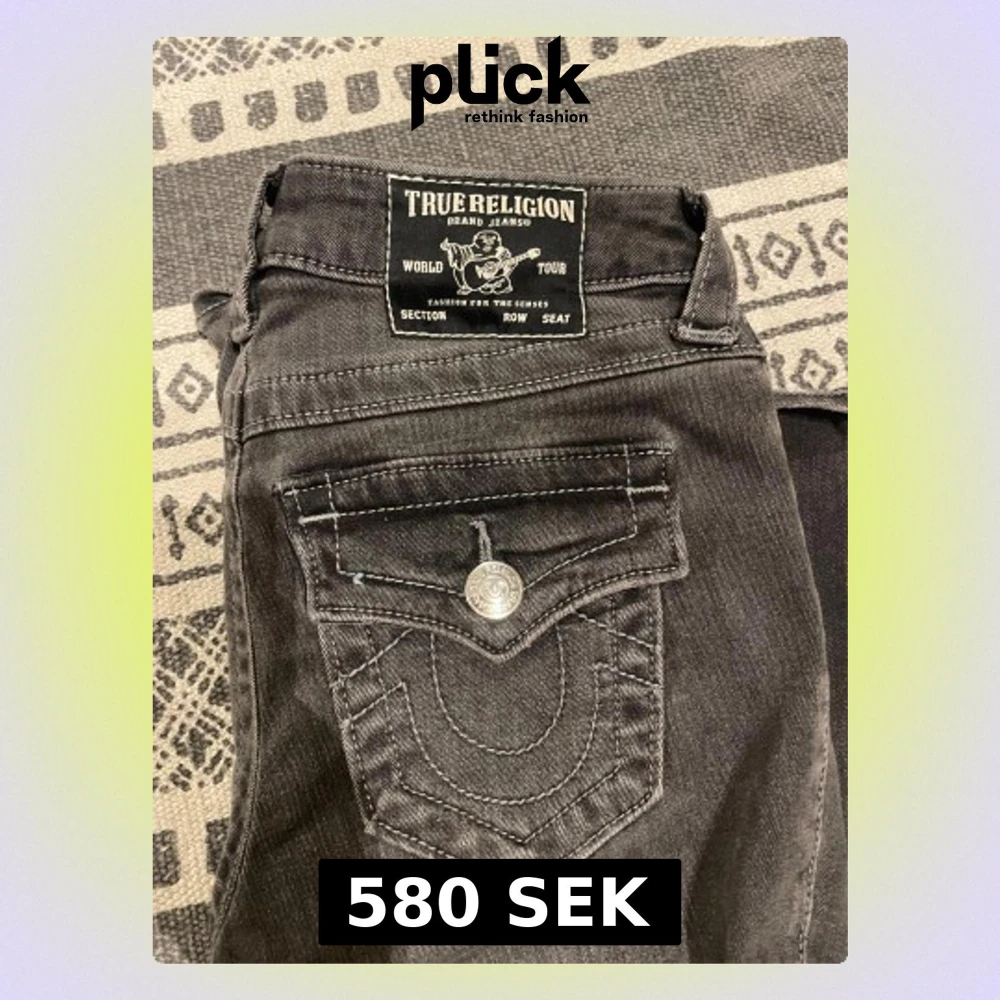 Ett par snygga grå-svartajeans med detaljer på fickorna och en bootcut modell. Omkretsen vid midjan: 68cm. Innerbenets längd: 84cm.