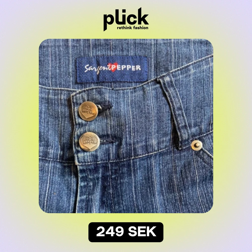 Coola jeans, utsvängda och lite randiga i tyget. 70tals vibes! Säljer då de inte sitter helt 100 på mig. Mått tvärs över midjan: 40cm Innerbenslängd: 75cm Längd på hela byxan: 101cm Ena knappen sitter lite löst, skriv för fler bilder på det!