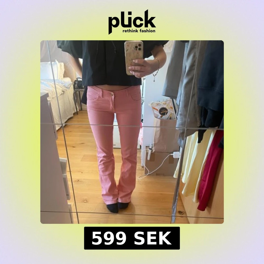 lågmidjade rosa jeans i nyskick! Jag är 163 o passar mig bra i längden! Så snygga nu till våren ☀️ 💓
