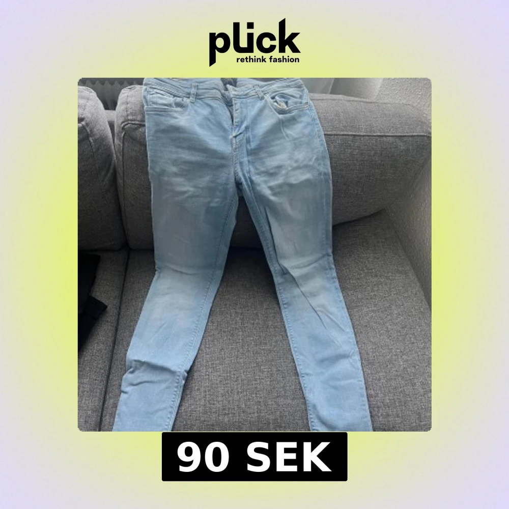 Säljer ett par ljusblå skinny jeans med klassisk femficksdesign och normalhög midja. Jeansen har dragkedjegylf och smal passform hela vägen ner. Perfekta för dig som gillar en enkel och stilren look.