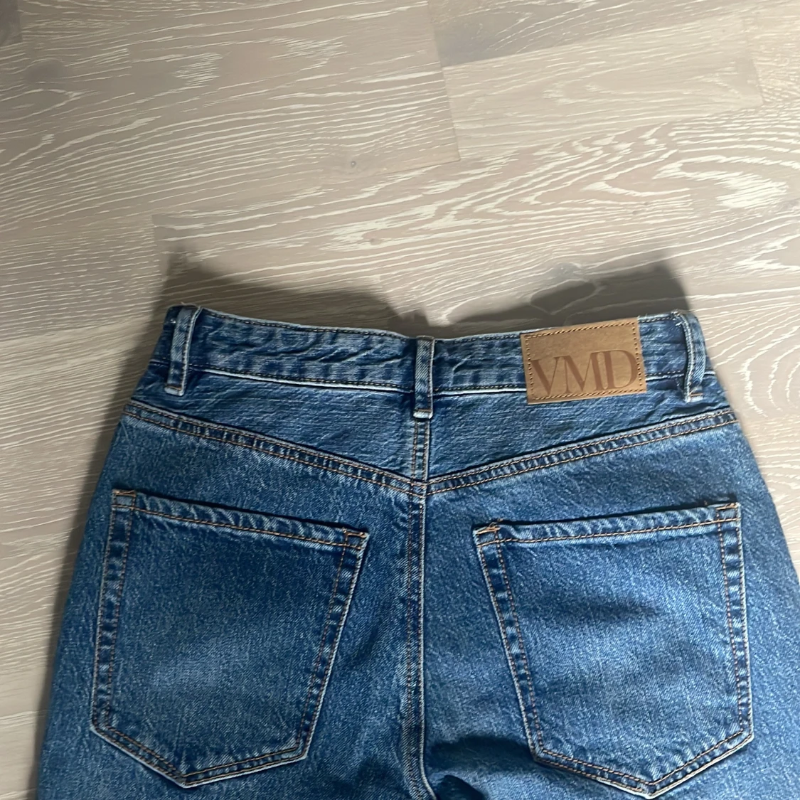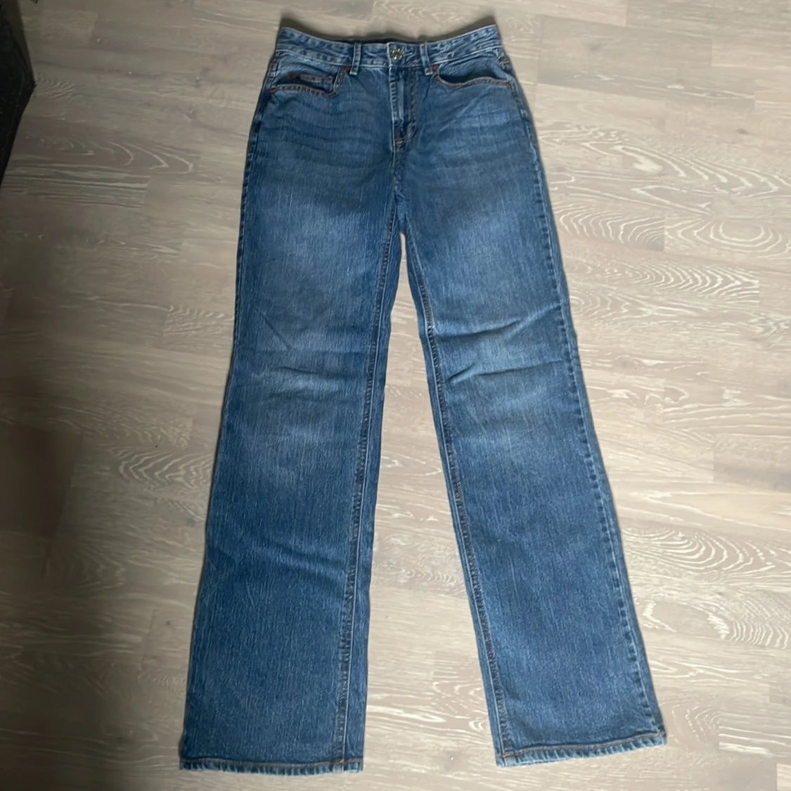 Ett par mörkblåa jeans, medelhög midja. Aldrig använda. I stolek 32 (xs). Skriv för mer information
