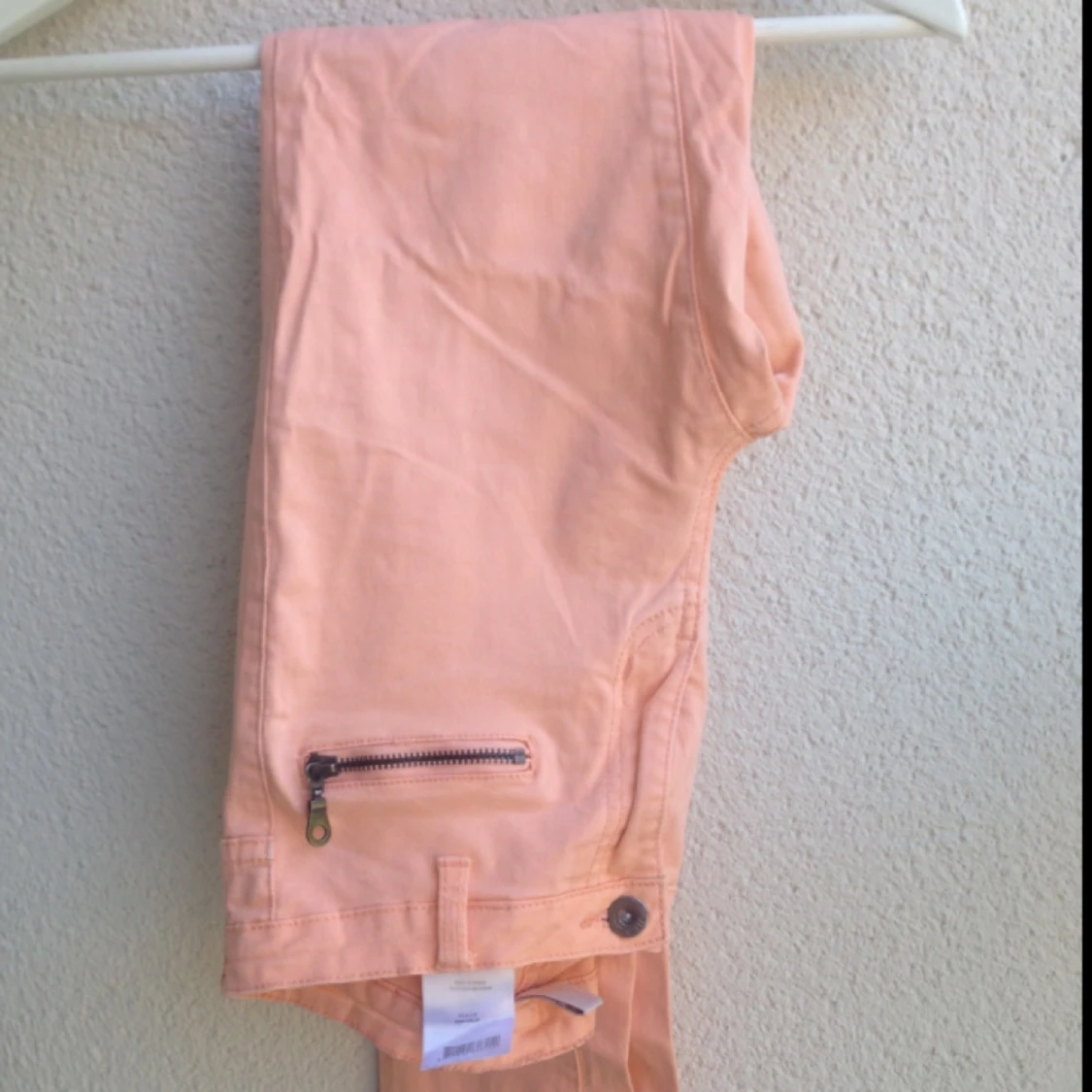 Persikofärgade byxor från Vila. Storlek M men väldigt mycket stretch så skulle säga att den passar S eller XS bäst.