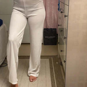 Sköna vita utsvängda byxor från boohoo, storlek 34! Ganska genomskinliga. Helt oanvända men ingen prislapp kvar