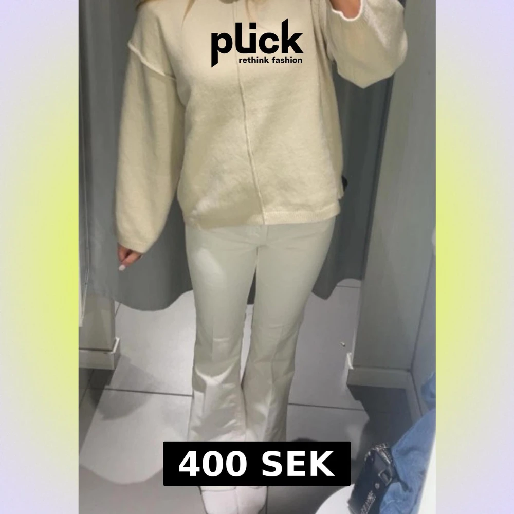 Säljer ett par vita bootcut byxor med hög midja. Byxorna har en snygg och modern passform som sitter tajt över låren och släpper ut vid bensluten. Materialet känns mjukt och har en lätt stretch, perfekt för dig som gillar stilrena och ljusa outfits. Helt nya!!
