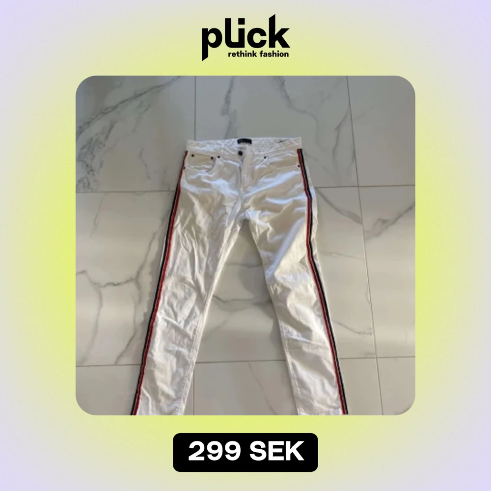 Säljer ett par vita byxor från Zara med coola röda och svarta ränder längs sidorna tsm med fin grå Tshirt. Båda för 299kr. De är i storlek EUR 42 och har en klassisk femficksdesign med knapp och dragkedja. Perfekta för en avslappnad men stilren look!