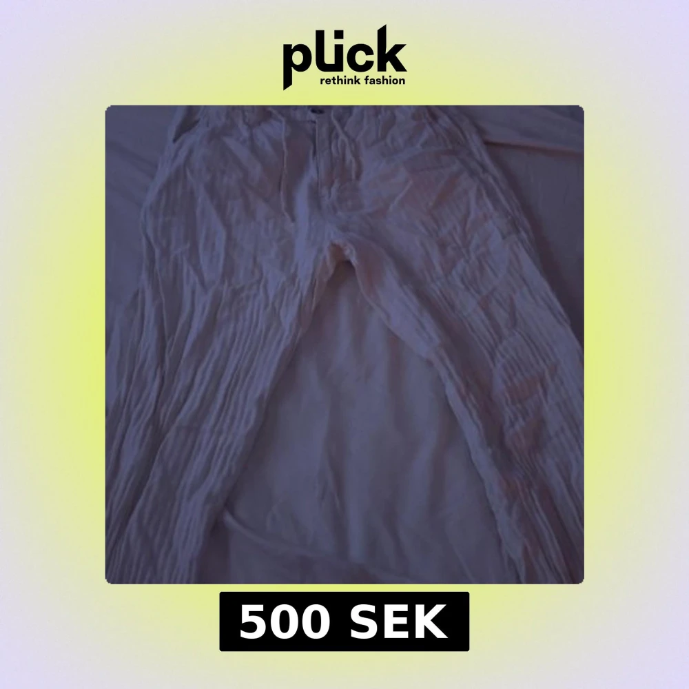 Säljer ett par vita linnebyxor från Lindbergh med avslappnad passform och resår i midjan med snörning. Byxorna har en lätt skrynklig struktur och är perfekta för varma dagar. Stilrena och enkla att matcha med olika toppar.