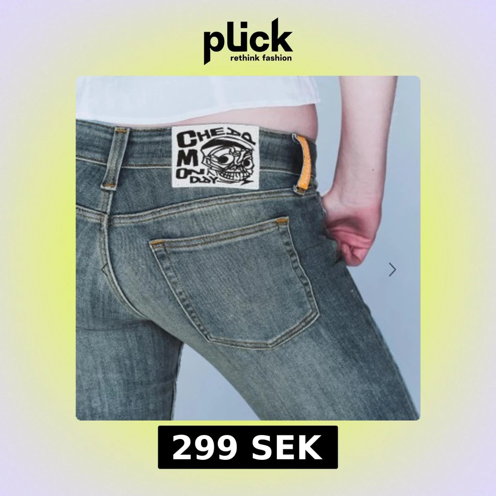 Säljer ett par gråa bootcut jeans från Cheap Monday med låg midja och klassisk femficksdesign. Jeansen har en snygg tvättad look, orangea detaljer och det ikoniska Cheap Monday-märket bak i midjan. Perfekta för dig som gillar retrovibbar och sköna jeans.