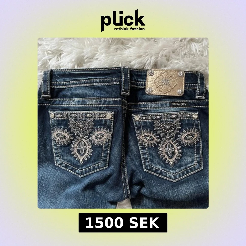 Snygga mörkblå skinny jeans från Miss Me med detaljerade broderier på bakfickorna. Super snygga!! Man kan göra dem till bootcut, klippa till kjol/shorts eller bara ha dem som dem är. 💞 Finns inte att få tag på dessa längre.