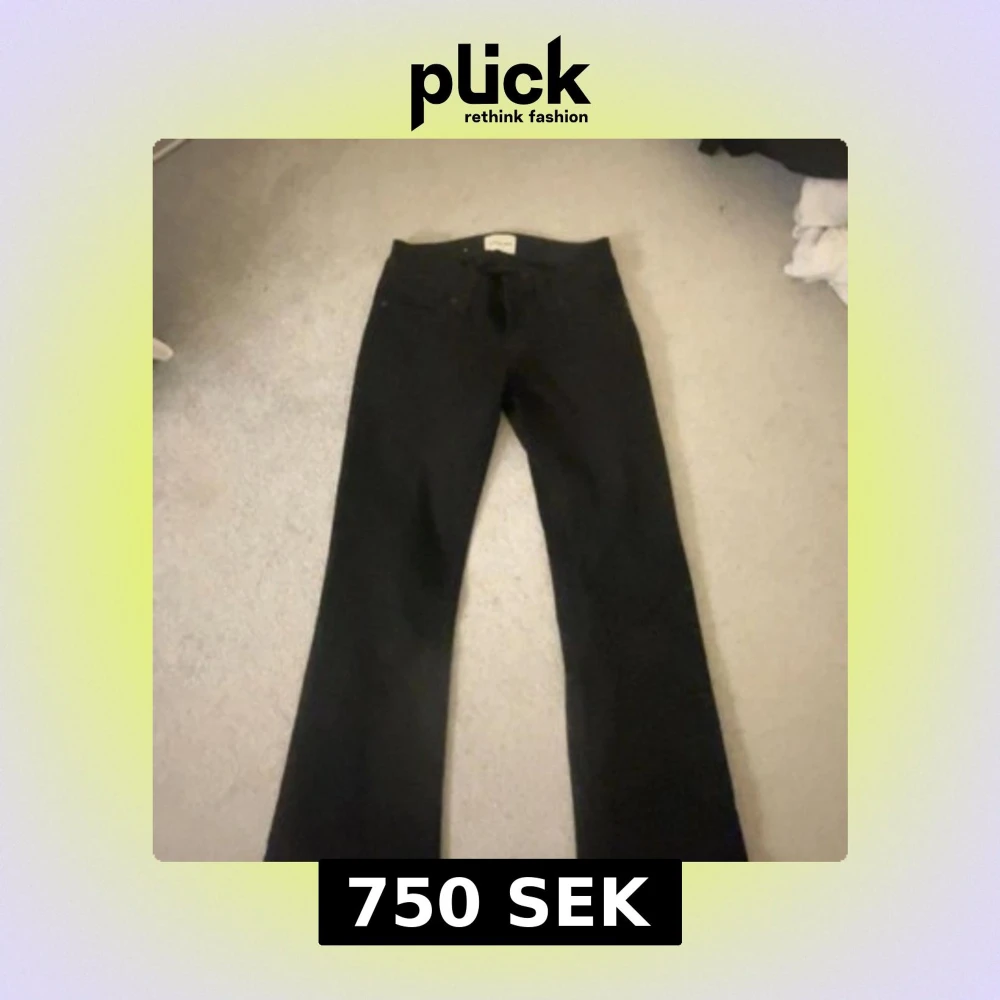 Svarta jeans från Abrand med klassisk femficksdesign och bootcut-ben. Jeansen har en stilren look med svarta sömmar och en liten patch på bakfickan. Materialet är jeans och passformen är normal med något utsvängda ben.