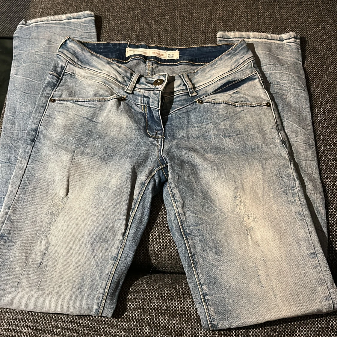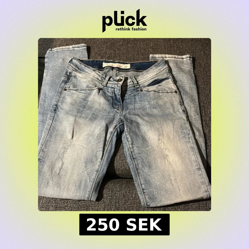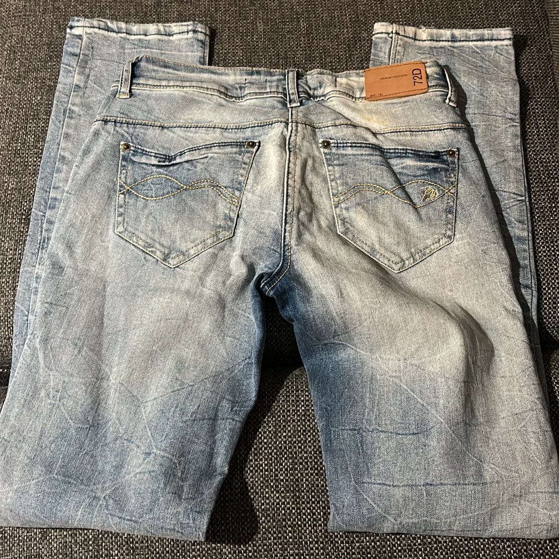 Säljer ett par ljusblå jeans från 72D med snygga slitningar och tvättad look. Jeansen har kontrastsömmar och raka ben. Materialet är jeans och har detaljerade bakfickor med broderi. Midjan är W26 och passar på mig som är 170