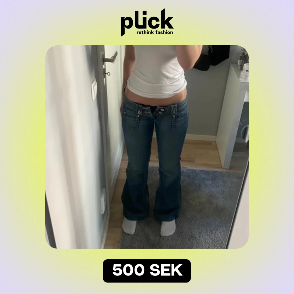 Lågmidjade blå bootcut jeans - Säljer ett par blå jeans med låg midja och bootcut-modell. Jeansen har klassiska fickor fram och bak samt en snygg tvättad look. Perfekta för dig som gillar en avslappnad och trendig stil.