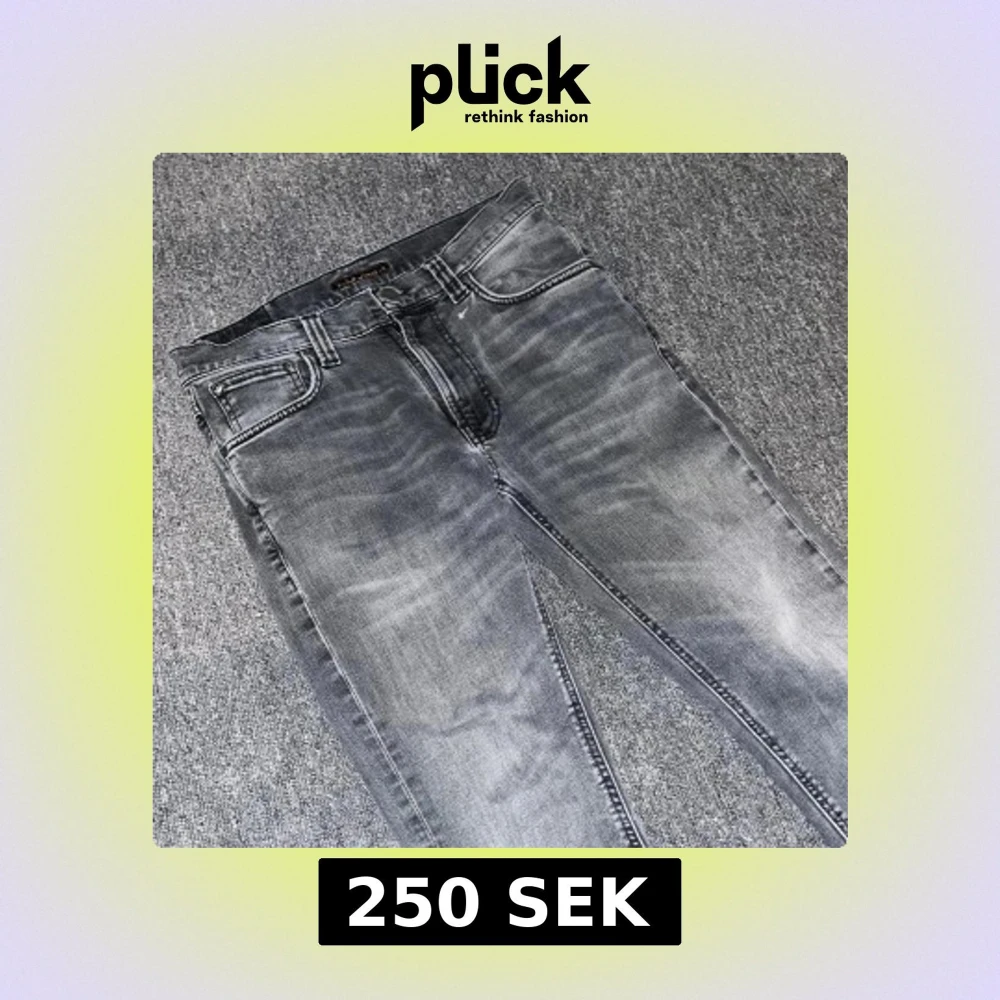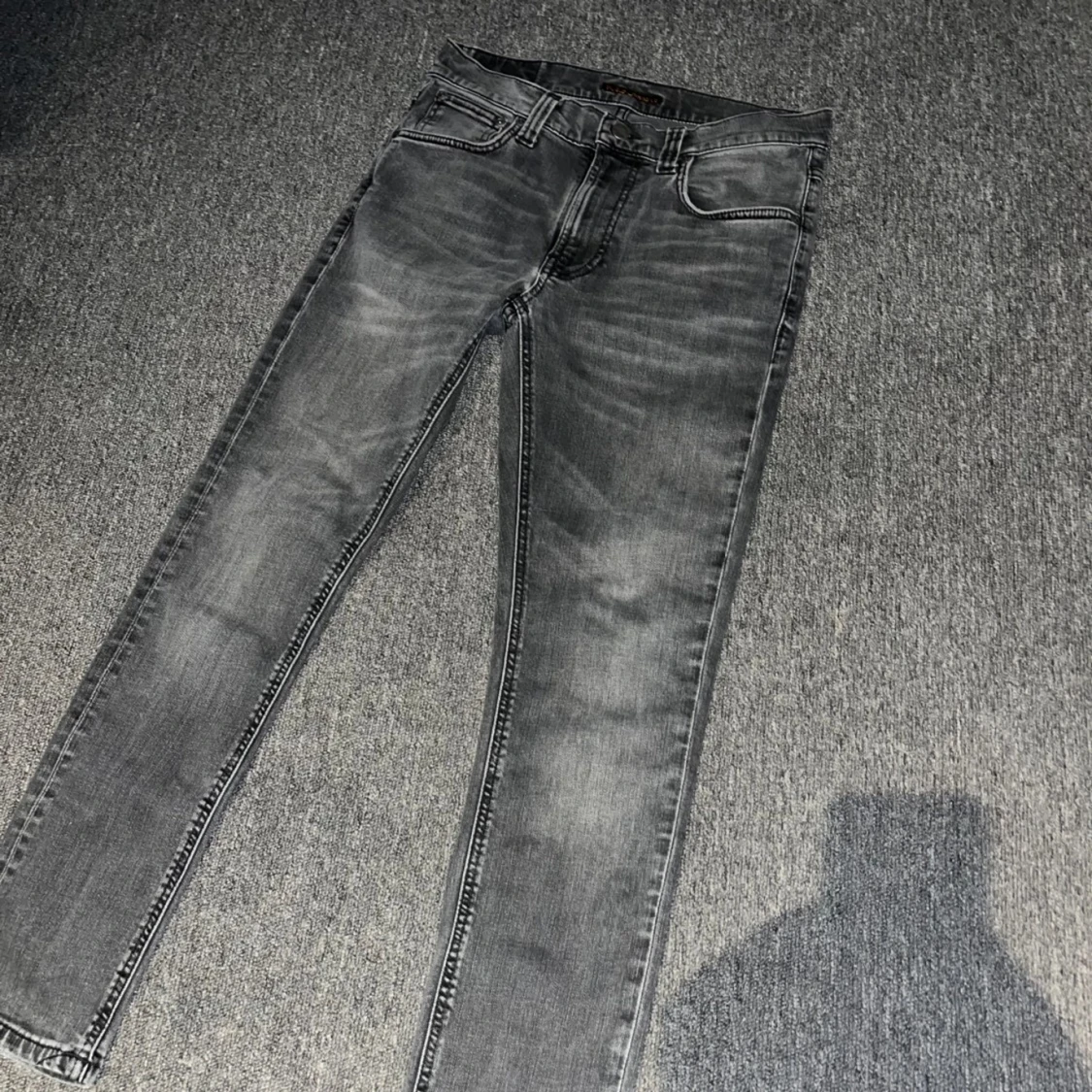 Snygga grå jeans från Nudie Jeans med en klassisk femficksdesign. De har en slim passform och är tillverkade i slitstarkt denim. Perfekta för en avslappnad stil med en touch av edge. Storlek w28, l28.