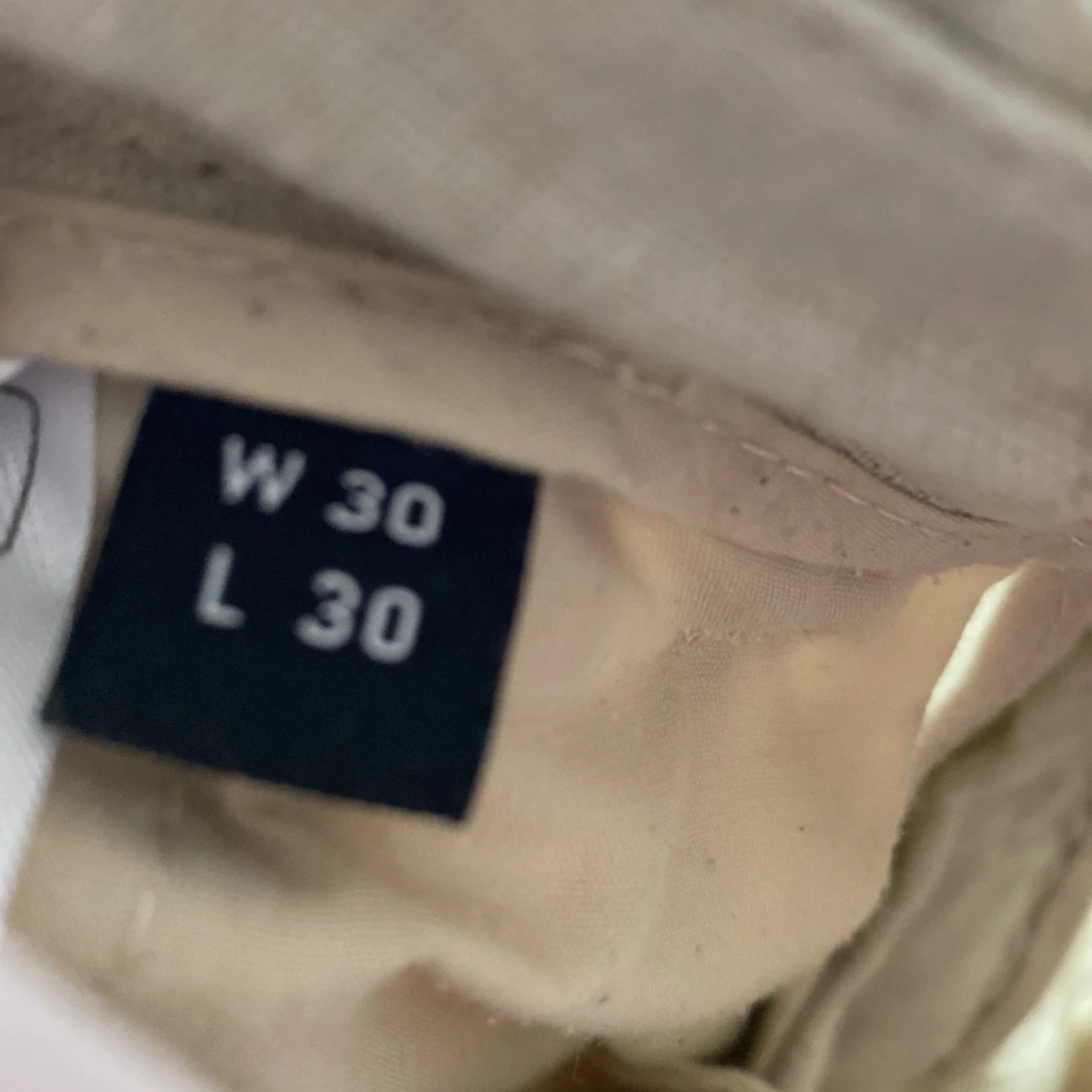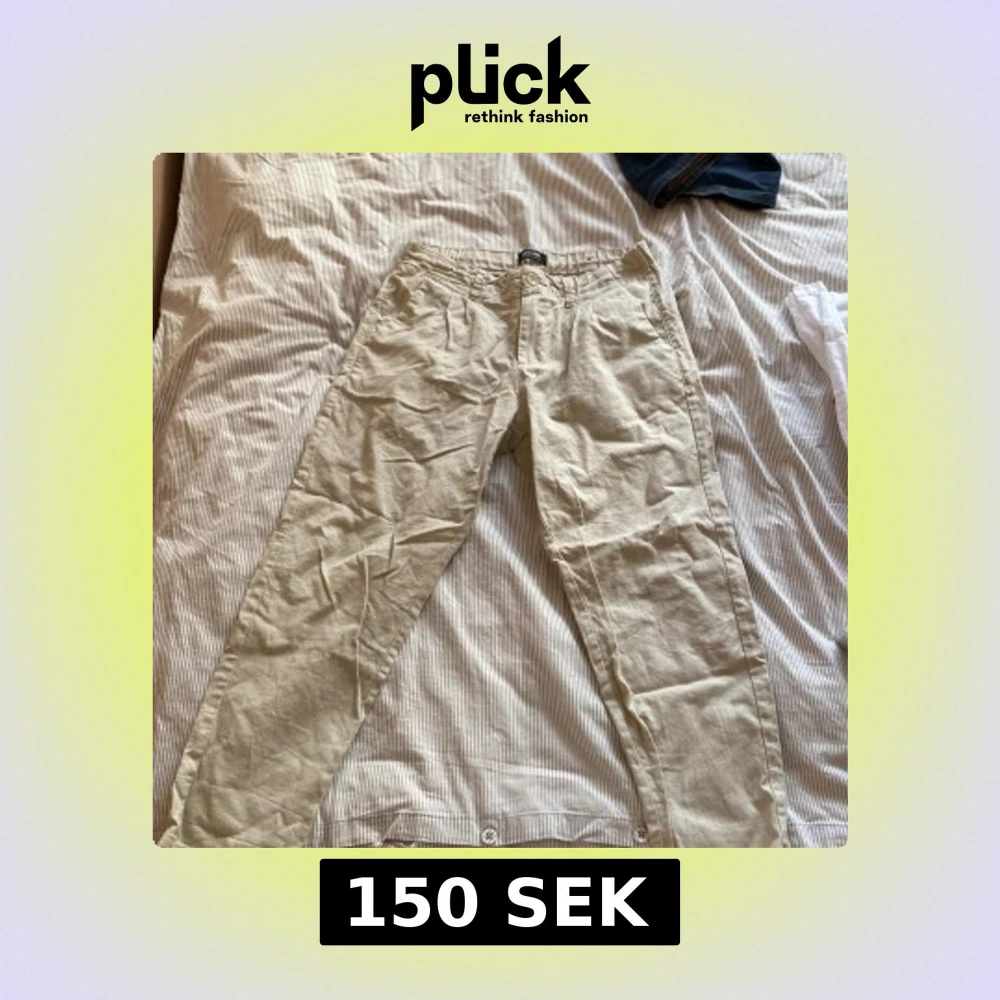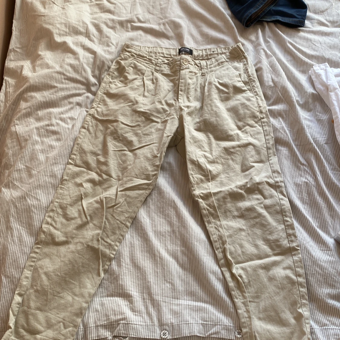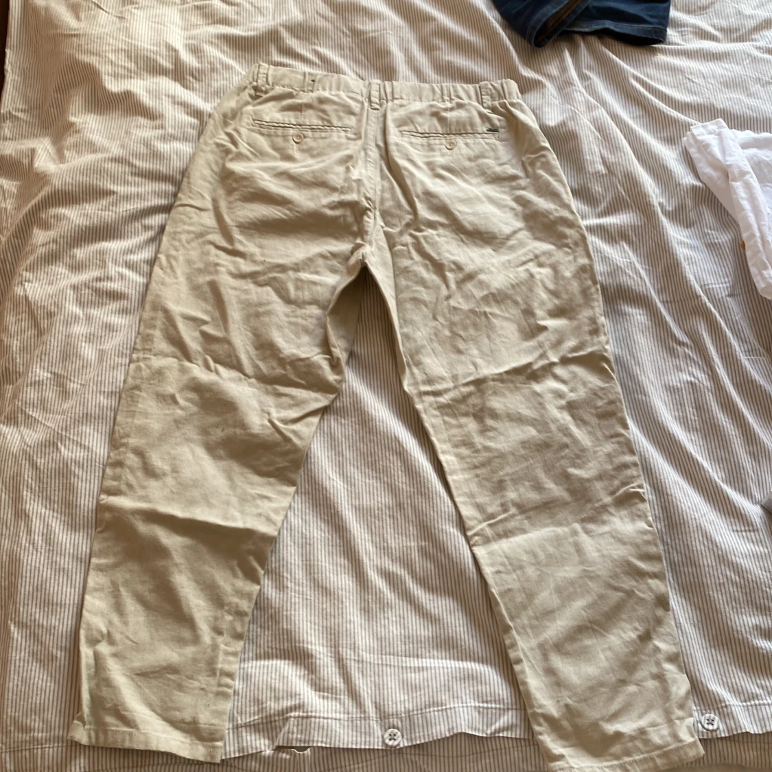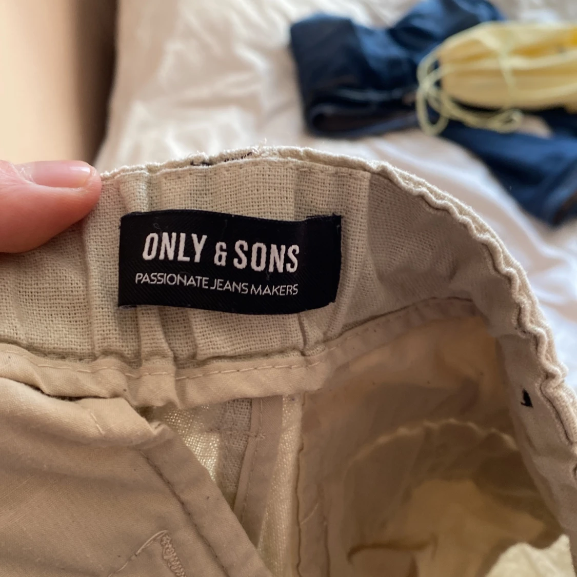 Säljer ett par stilrena beige linnebyxor från Only & Sons. Byxorna har en normal passform och är perfekta för varmare väder. De har en klassisk design med knappar och dragkedja framtill.