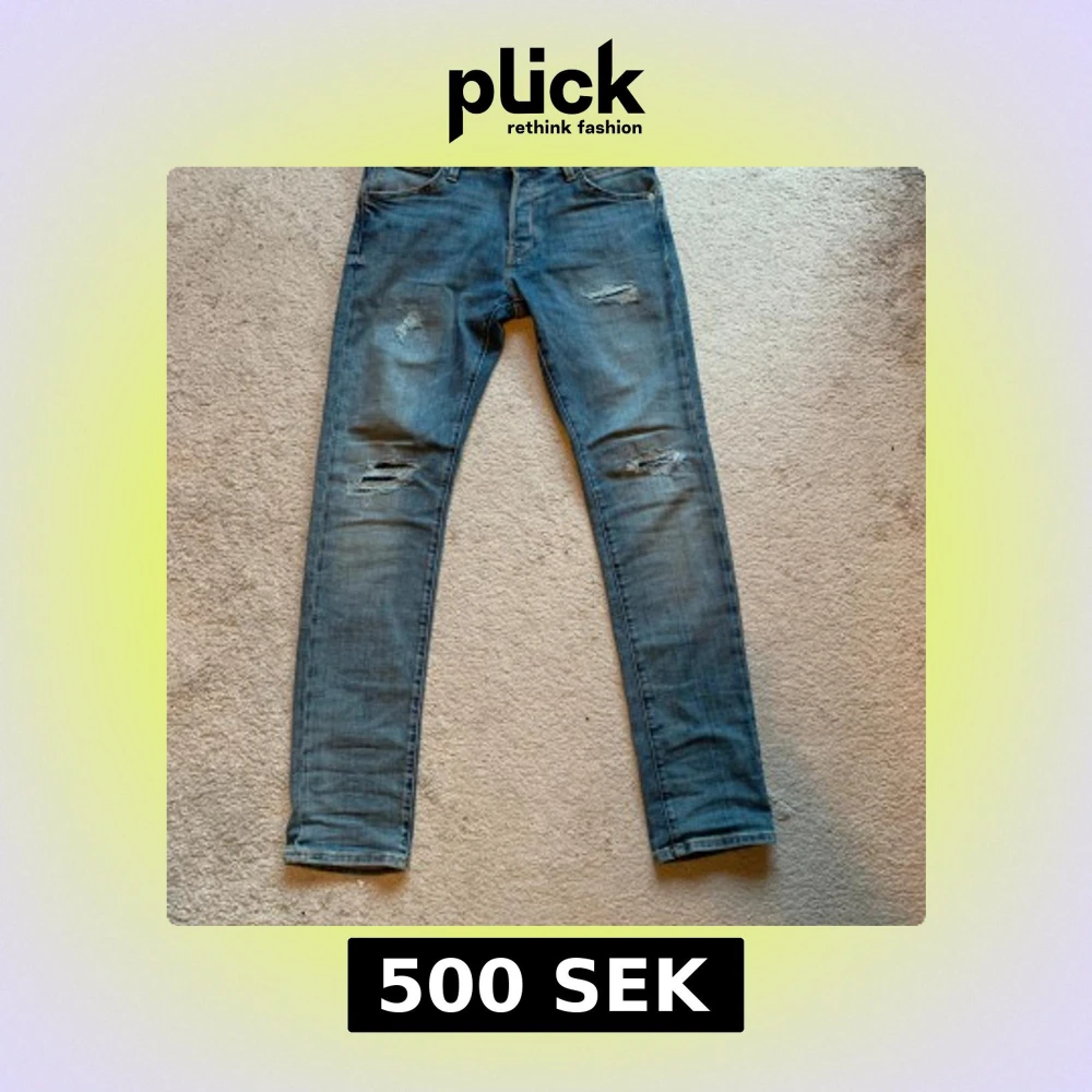 Säljer ett par ljusblå jeans med slitningar från jack&jones på både lår och knän. Klassisk femficksmodell med normal passform och raka ben. Perfekta för en avslappnad stil. Strl w30L32
