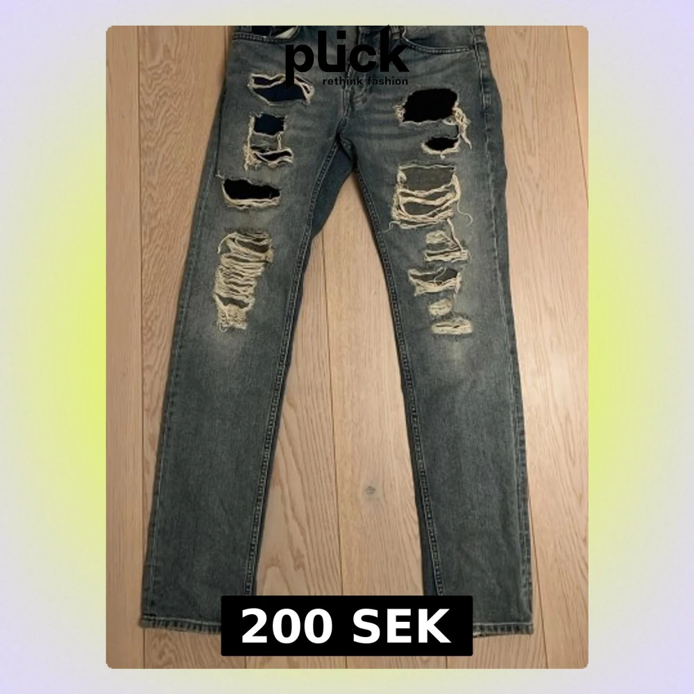 Säljer ett par grå jeans med rejält slitna detaljer och stora hål på båda benen. Byxorna har en rak passform och är tillverkade i klassiskt jeanstyg. Perfekt för dig som gillar en edgy och avslappnad stil.