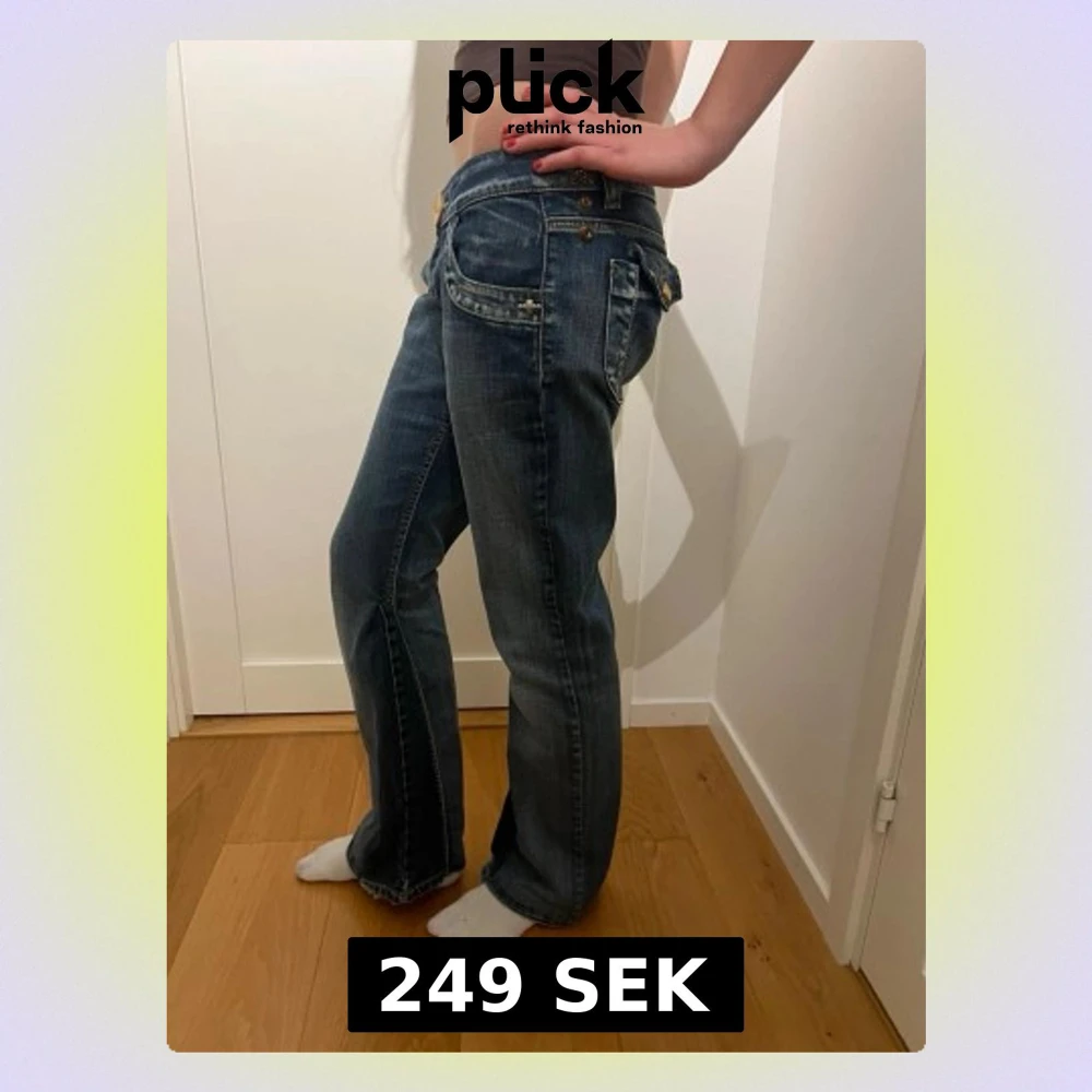 Säljer ett par blå jeans med låg midja och bootcut-ben. Jeansen har snygga detaljer som guldknapp framtill och dekorativa fickor med lock och knapp bak. Materialet är klassisk denim och passformen är loose med bredare benslut. Storleken är 31