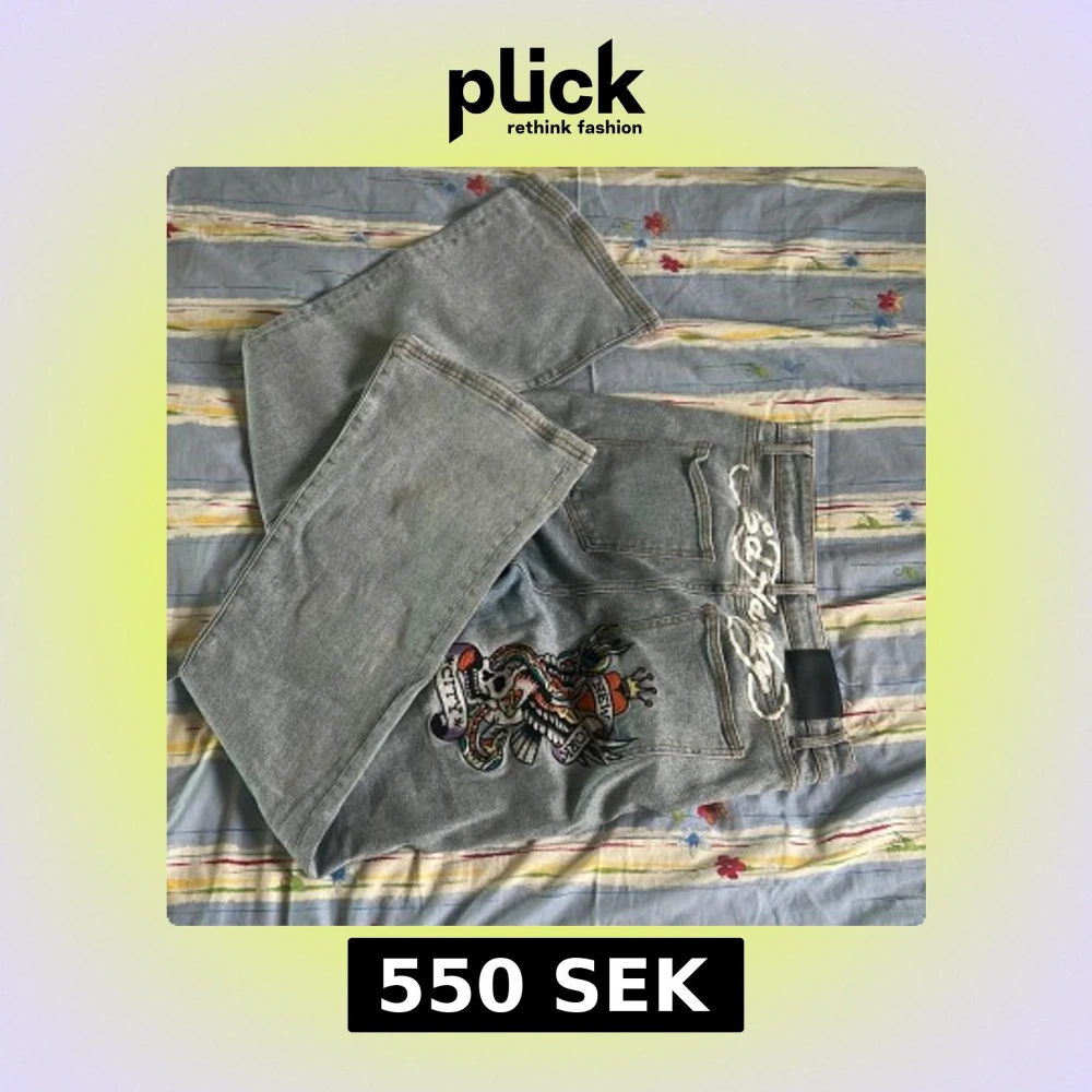 Säljer ett par grå jeans från Ed Hardy med en stor broderad design på ena benet. Jeansen har klassisk femficksmodell och raka ben. Snygg streetstil med unikt broderi som sticker ut. Använda max 2 gånger. Priset kan diskuteras!!