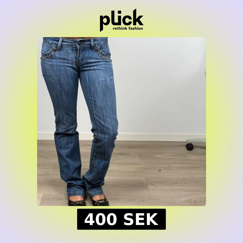 Snygga blå jeans från Big Bell med broderade detaljer och paljetter på bakfickorna. Jeansen har normal passform, raka ben och dekorativa nitar framtil med coola detaljer som sticker ut. Storleken är W 27 L 32