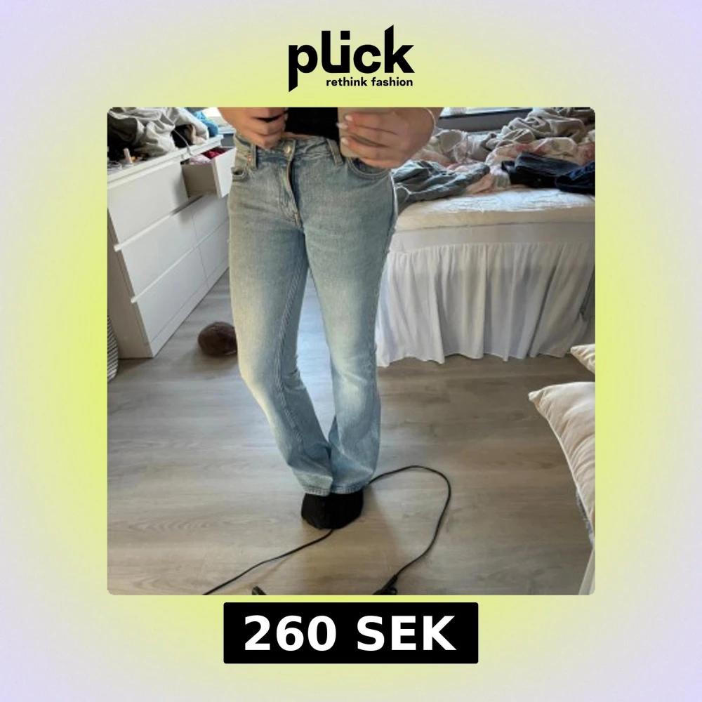 Säljer ett par ljusblå Flame Low Flared jeans från Weekday. Dem är använda men finns inga tecken på de. Nypris 560🩷