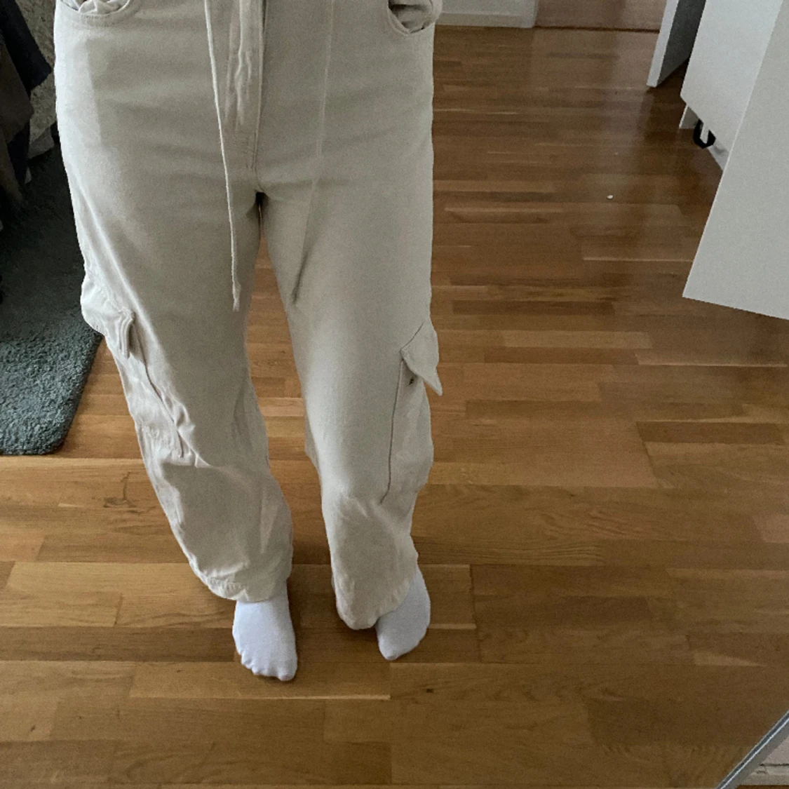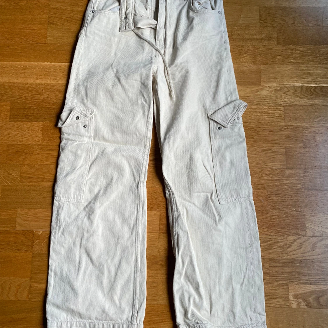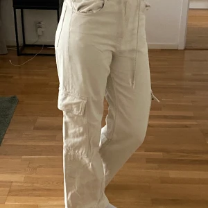 Ett år tjocka ”cargo” byxor i beiget från weekday! Mycket bra skick! Jag är 175cm lång!