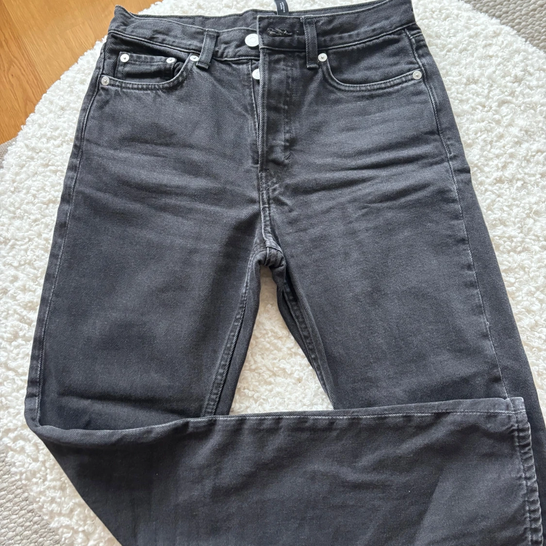 Snygga svarta jeansbyxor från Weekday med knappgylf och klassisk femficksdesign. Perfekta för en stilren look. Storlek 24/30 (låga i midjan)
