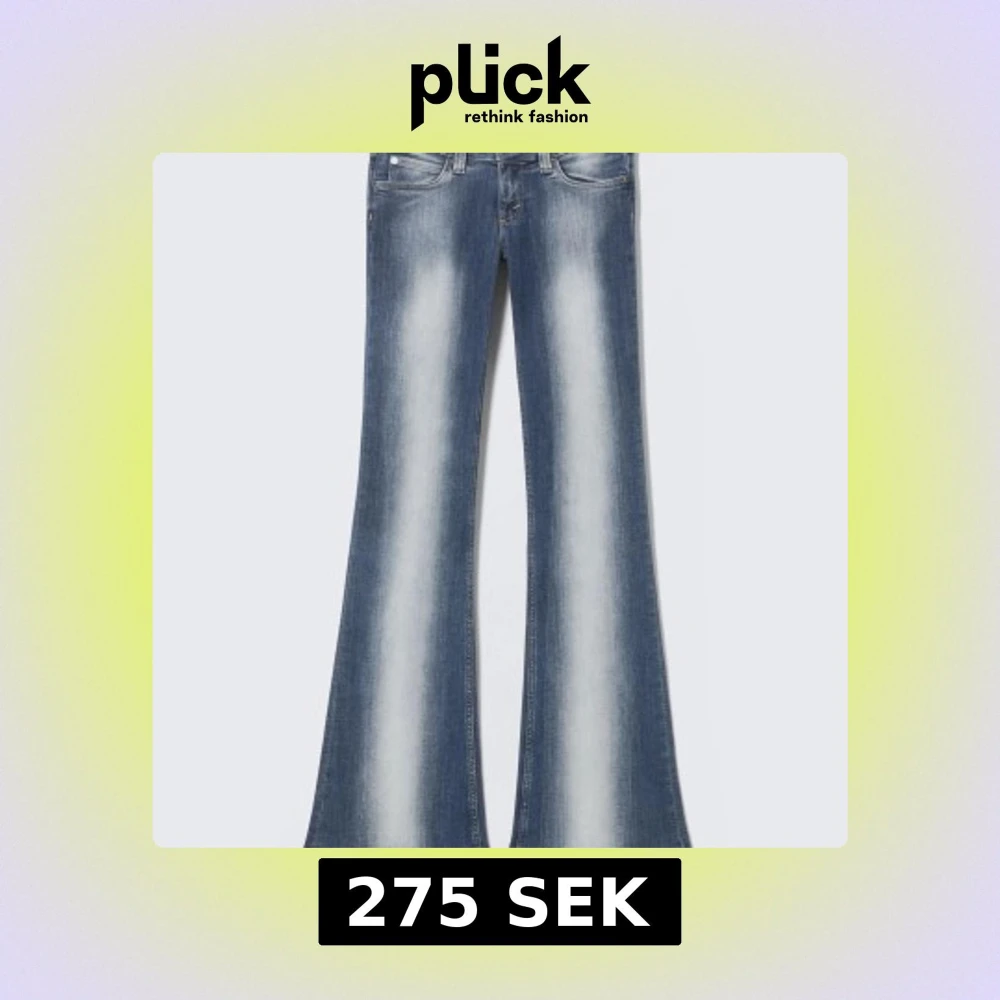OBS det blå är ljusare k verkligheten, W26/L30 Snygga blå bootcut jeans med tydliga blekta partier längs benen. Klassisk femficksmodell med dragkedja och knapp. Jeansen har en riktigt utsvängd siluett som ger en retrovibe och är tillverkade i mjukt denimtyg.