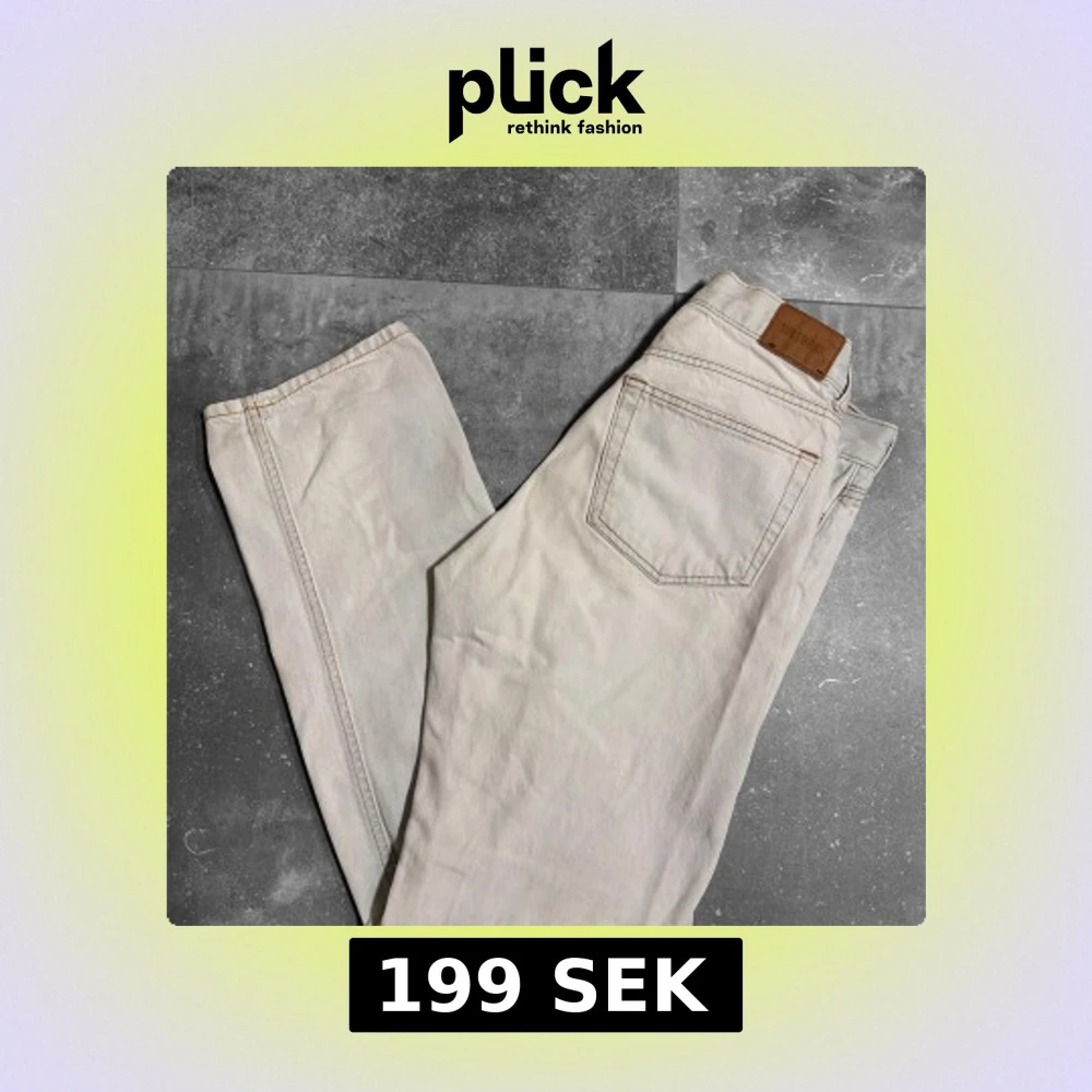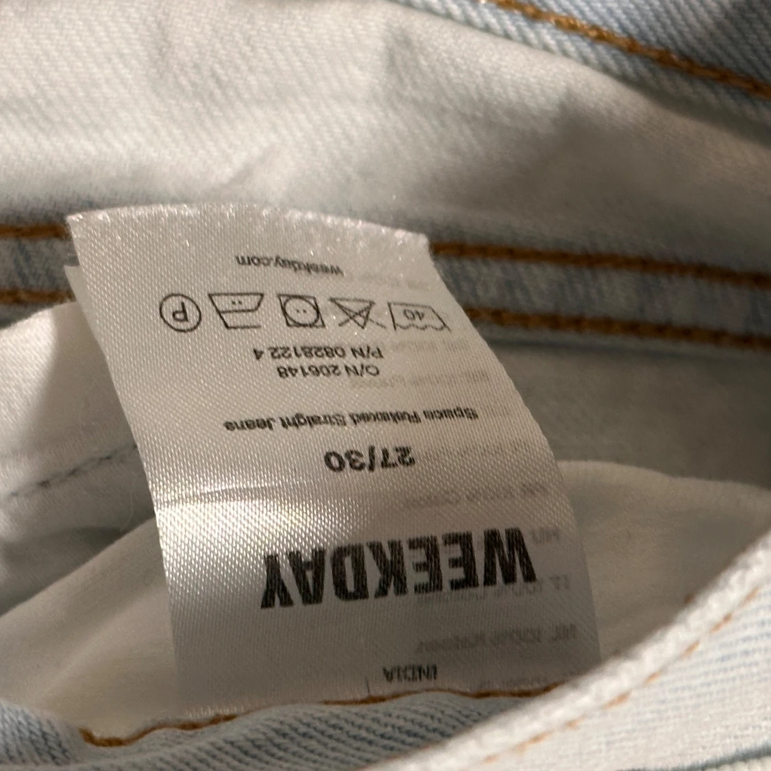 Bra skick, små missfärgningar, som syns i de sista bilderna. Märke: Weekday, Modell: Space Innerbenslängd: 72 cm Bredd: 38 cm